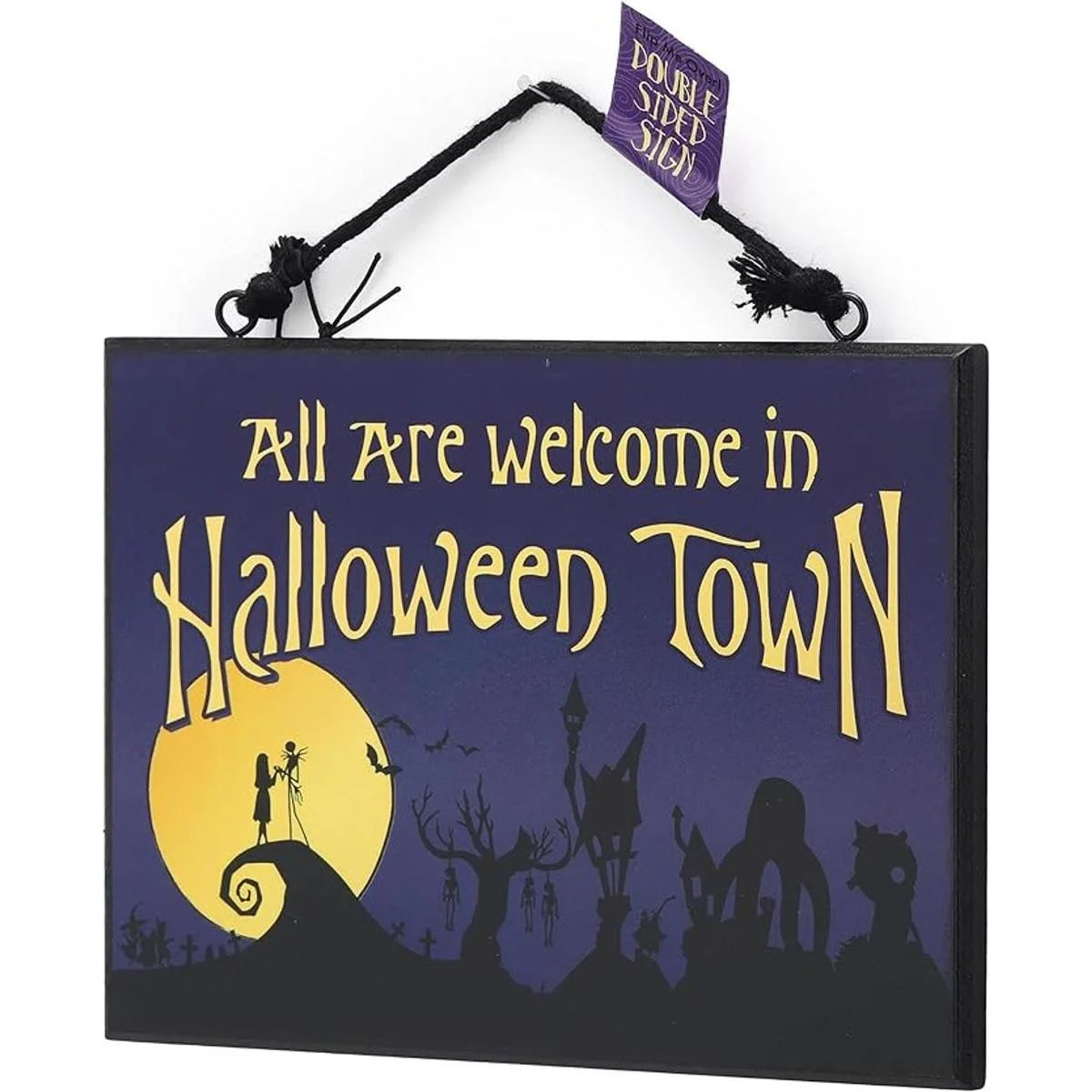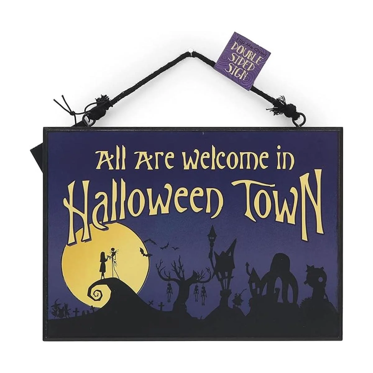 Open Road Brands Letrero colgante de doble cara de Disney The Nightmare Before Christmas todos son bienvenidos en la ciudad de Halloween