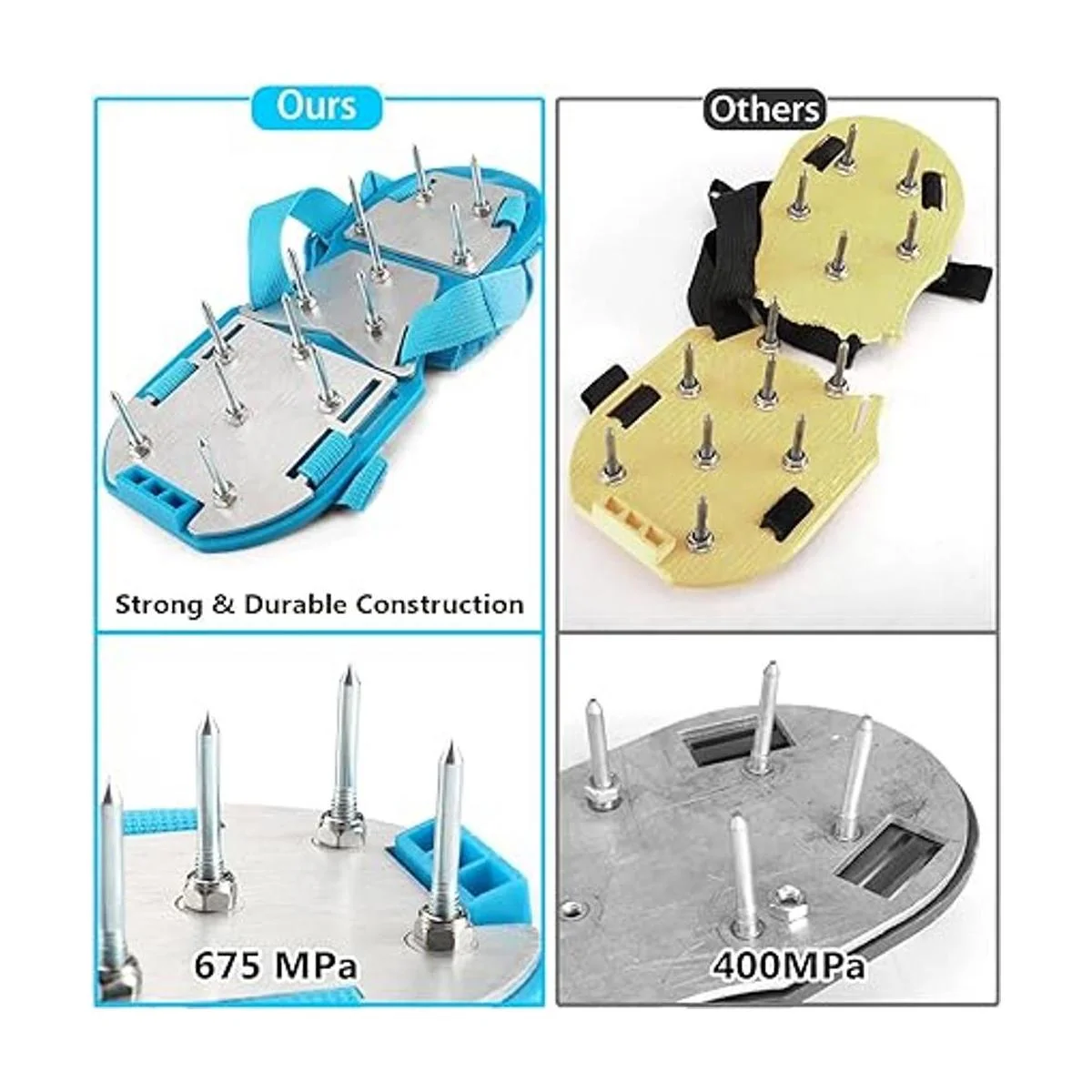 No requiere instalación: las 13 puntas de acero inoxidable en cada zapato se han montado. Solo tienes que sujetar tus correas. Airea tu jardín como un profesional.