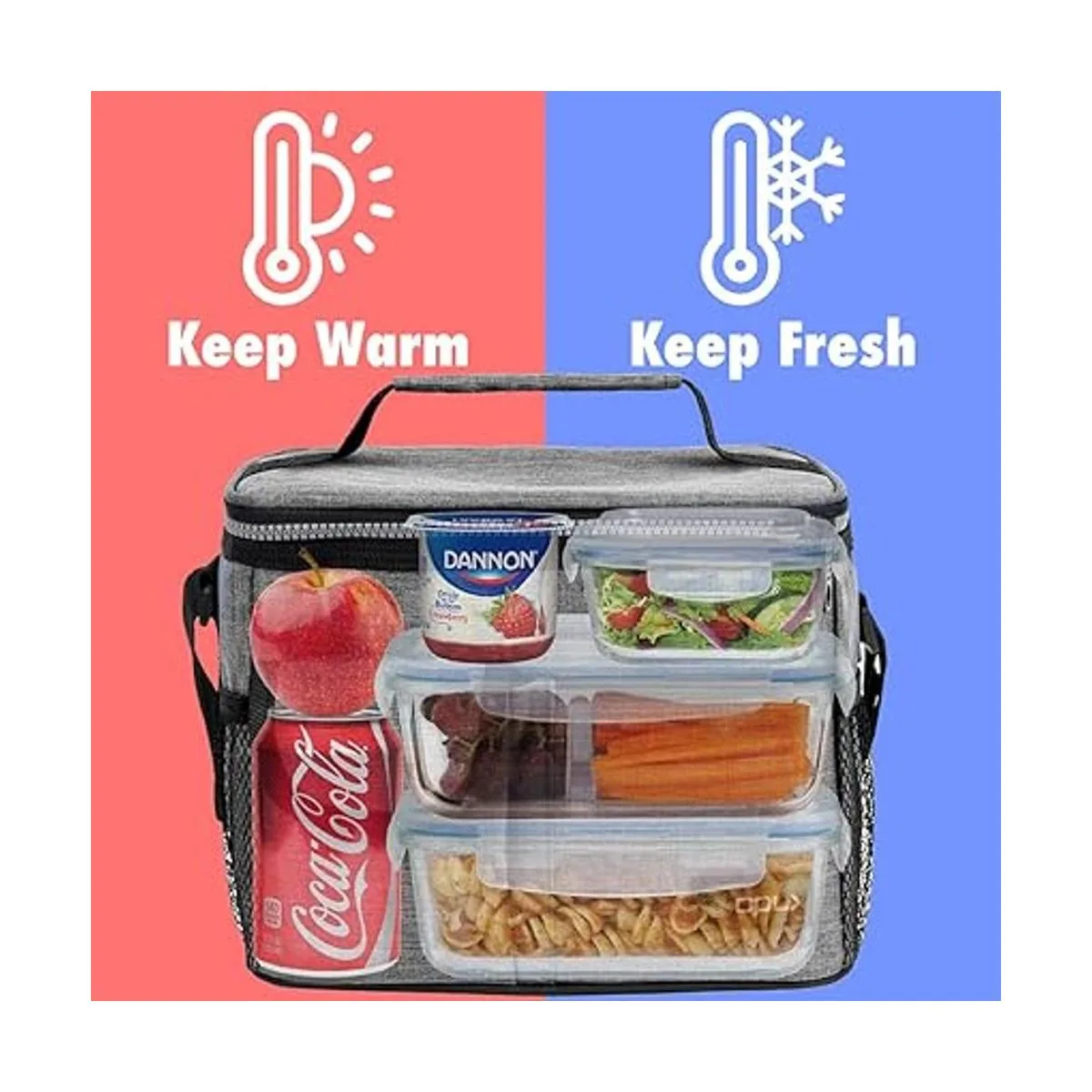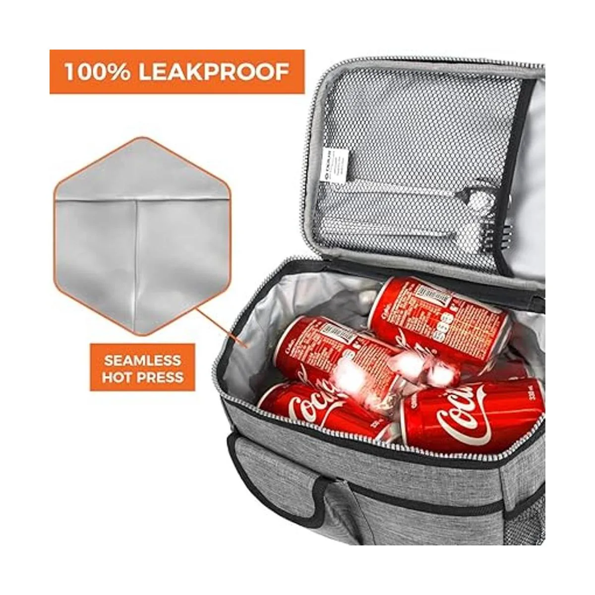 A prueba de fugas y aislamiento térmico: equipada con forro de PEVA ecológico que es suave, a prueba de fugas y aislante, esta lonchera es excelente para mantener tus bebidas frías o mantener tu comida caliente. Esta lonchera es lo suficientemente grande como para que le quepa un paquete de 6 latas de refresco, o a más de un almuerzo. Por su alto tamaño le caben hasta 18 latas