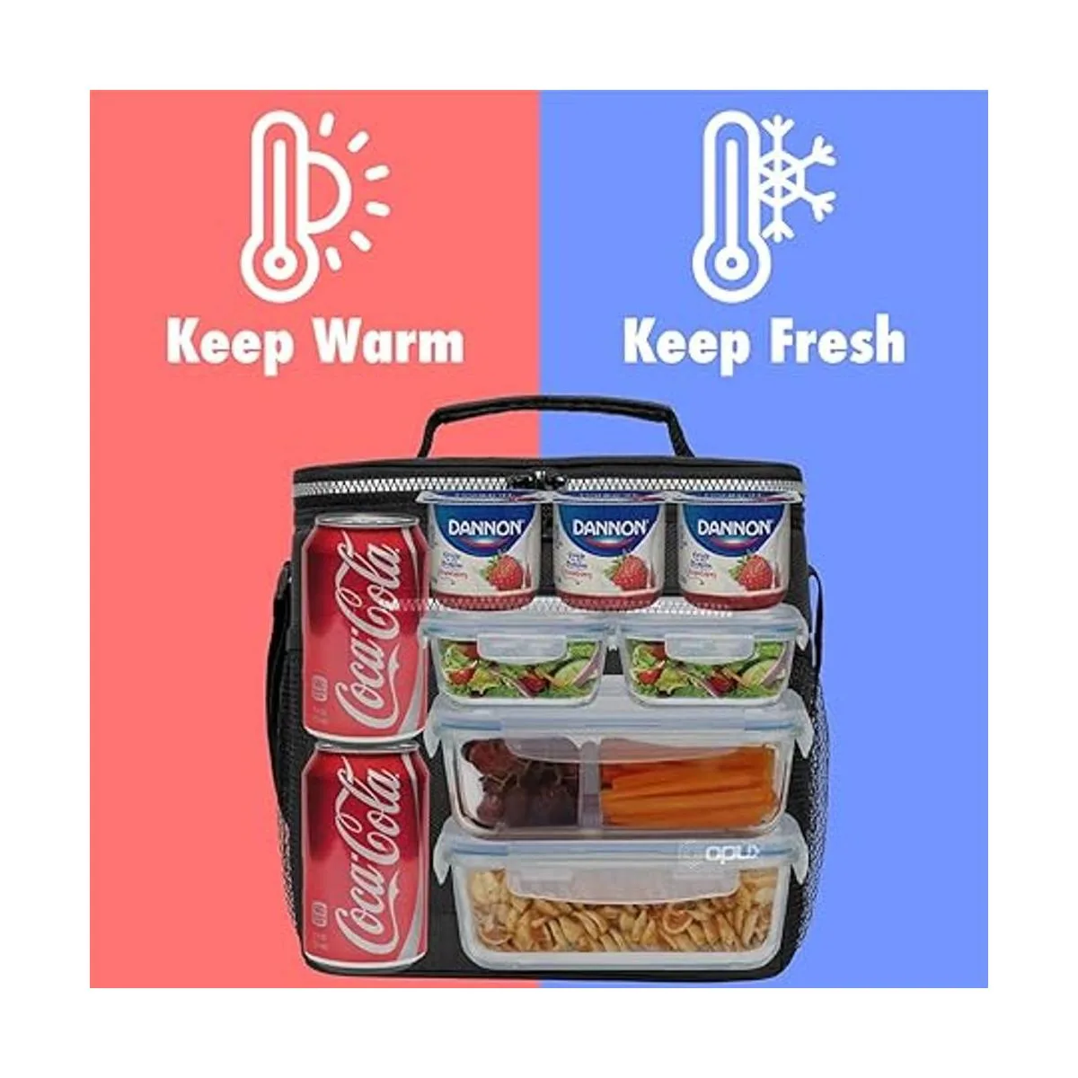 Grande, espaciosa y protege tu almuerzo: mide 10 x 8 x 9.5 pulgadas, esta lonchera grande se adapta fácilmente a 18 latas de refresco 11.2 fl oz y almuerzo de más de dos personas. Material grueso y suave que protege tu comida durante todo el día.
