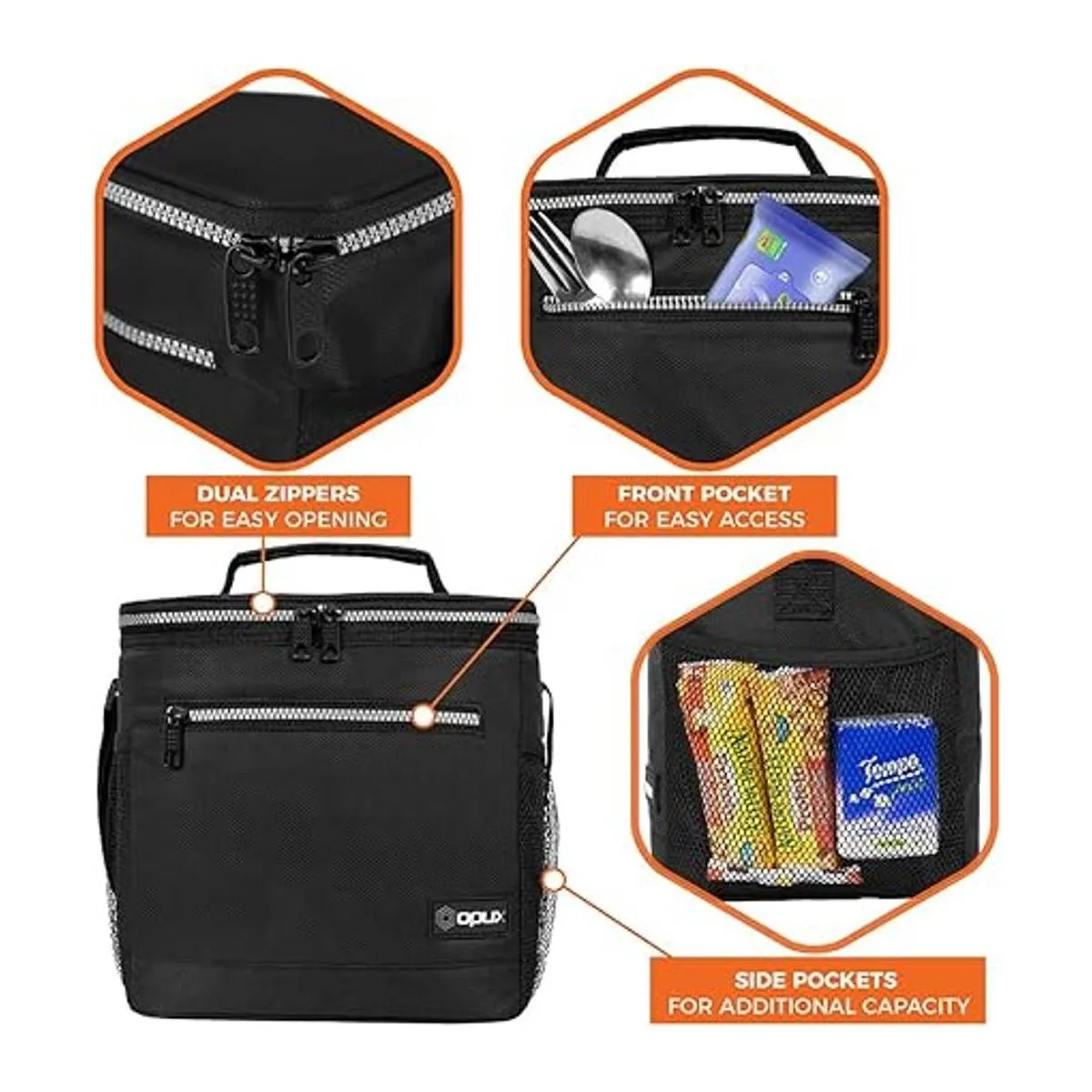 Diseño portátil funcional: correa de hombro ajustable para llevar esta bolsa de almuerzo alrededor de tu hombro o a mano. Bolsillos laterales de malla para un acceso rápido a la botella de agua, bolsillo frontal para utensilios y cremalleras dobles para apertura superior, ofreciendo una facilidad de uso inigualable.