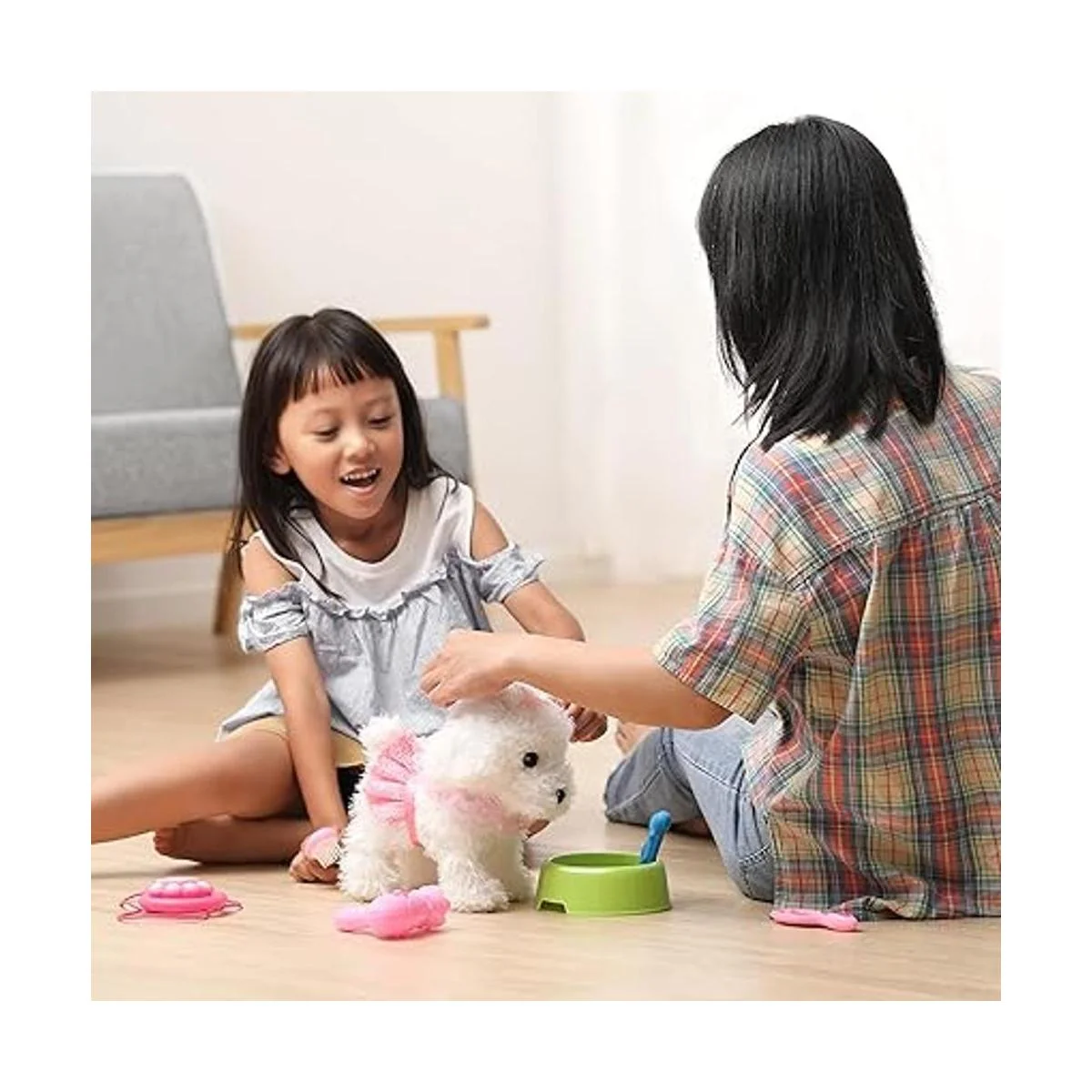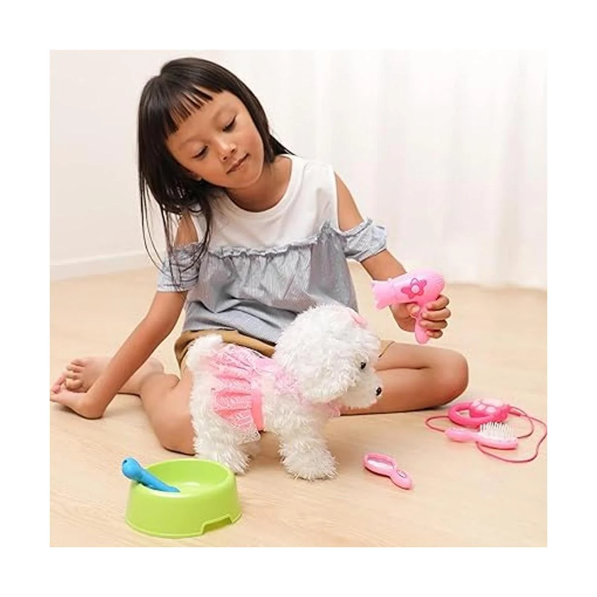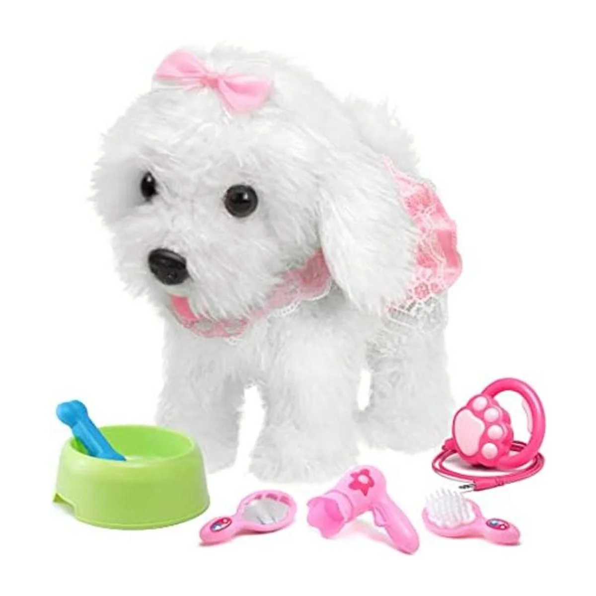 Cachorro eléctrico de peluche para niños El adorable cachorro de peluche eléctrico mide aproximadamente 9 pulgadas de alto, el mejor compañero para tener alrededor de los niños. Incluye 1 perro interactivo electrónico de felpa, 1 correa de control remoto, 1 peine, 1 secador de pelo, 1 espejo, también unido con un cuenco y hueso de goma suave para fingir que la mascota se alimente. Diviértete con tu mascota realista sin que se muerda o arañe. ed.