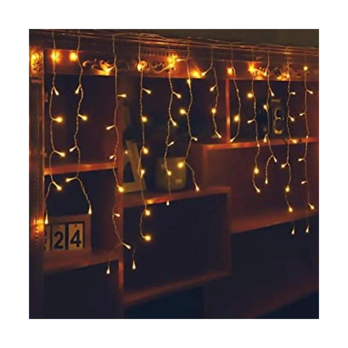 Tu hogar necesita una cadena de luces de carámbano: la luz blanca cálida naranja de 96 L es de 9.8 pies de ancho con 16 gotas y conector final; espacio de 7.9 pulgadas entre gotas de diferentes longitudes, longitudes de caída de 15.8 a 23.6 a 31.5 a 23.6 pulgadas.