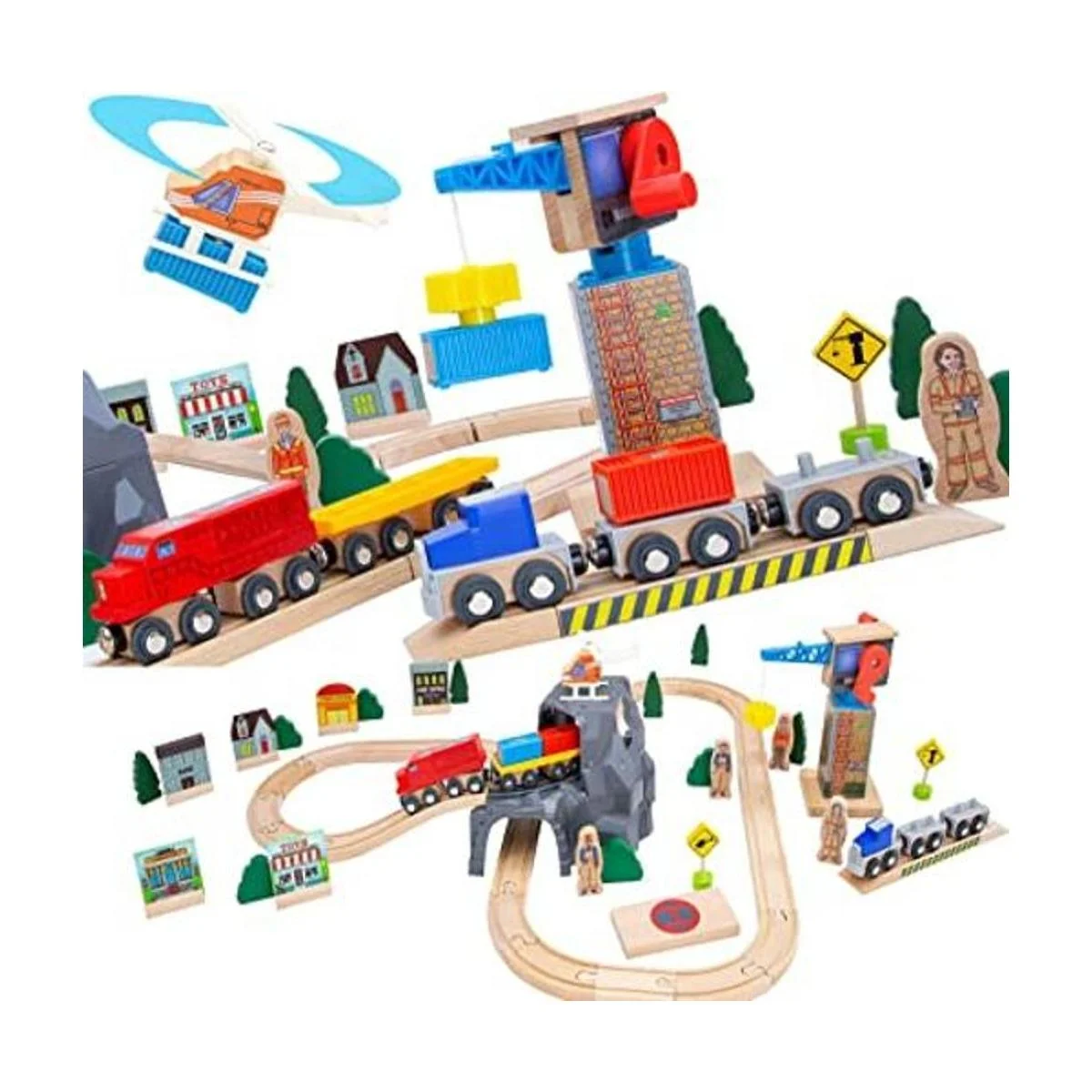 ORBRIUM Juego de tren de madera de elevación y carga con grúa magnética, helicóptero magnético, motor diésel grande, semicamión, contenedor de envío, automóvil plano compatible con Thomas, Brio, Chuggington, Melissa Doug