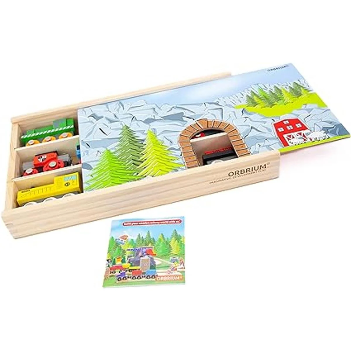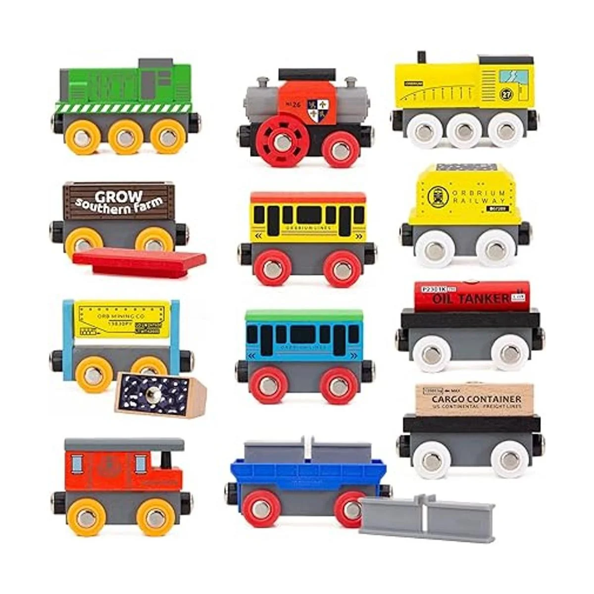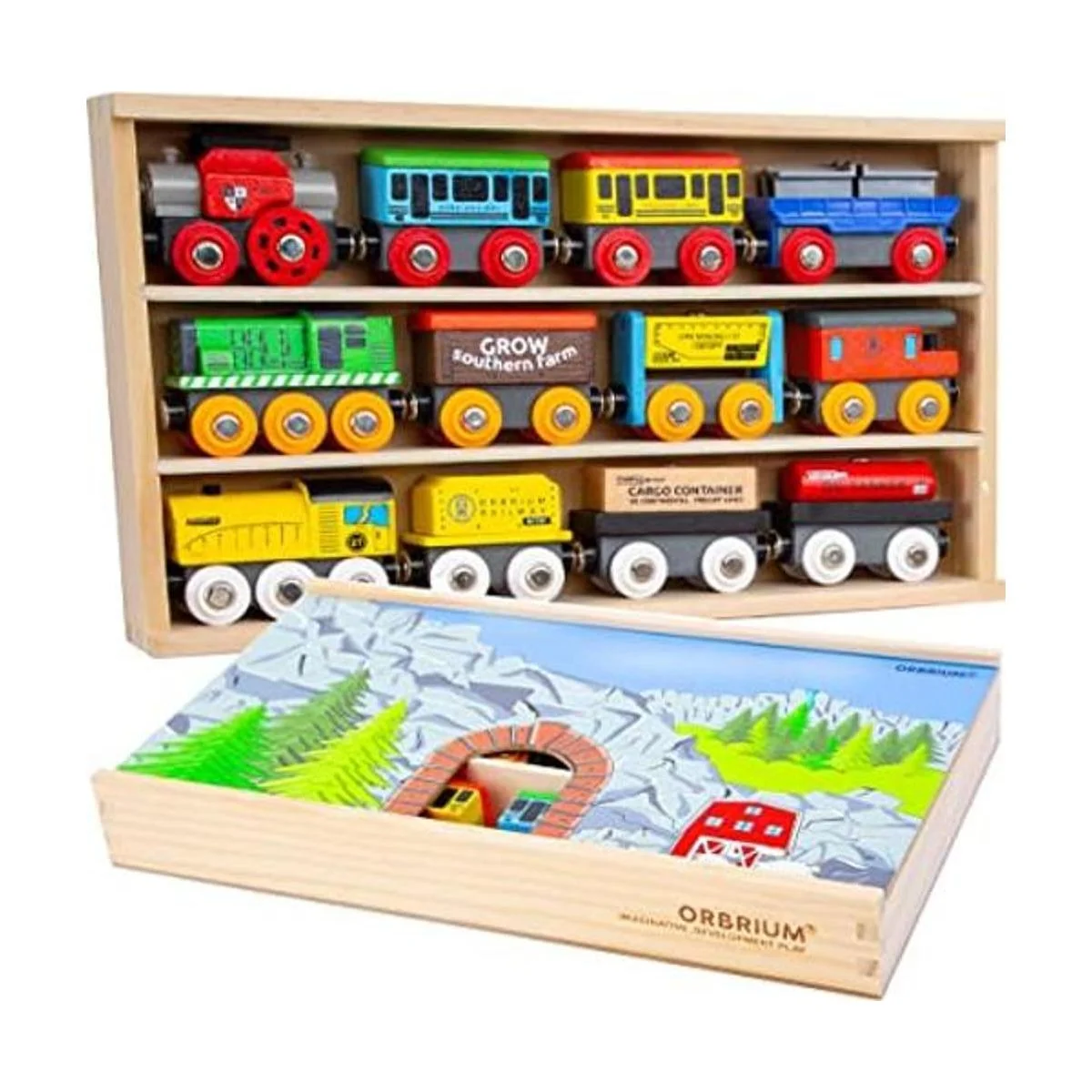 Orbrium Juguetes 12 20 piezas autos de tren de madera para niños cubierta de caja de madera de doble uso, juego de trenes de madera compatible con Thomas Wood Railway, Brio