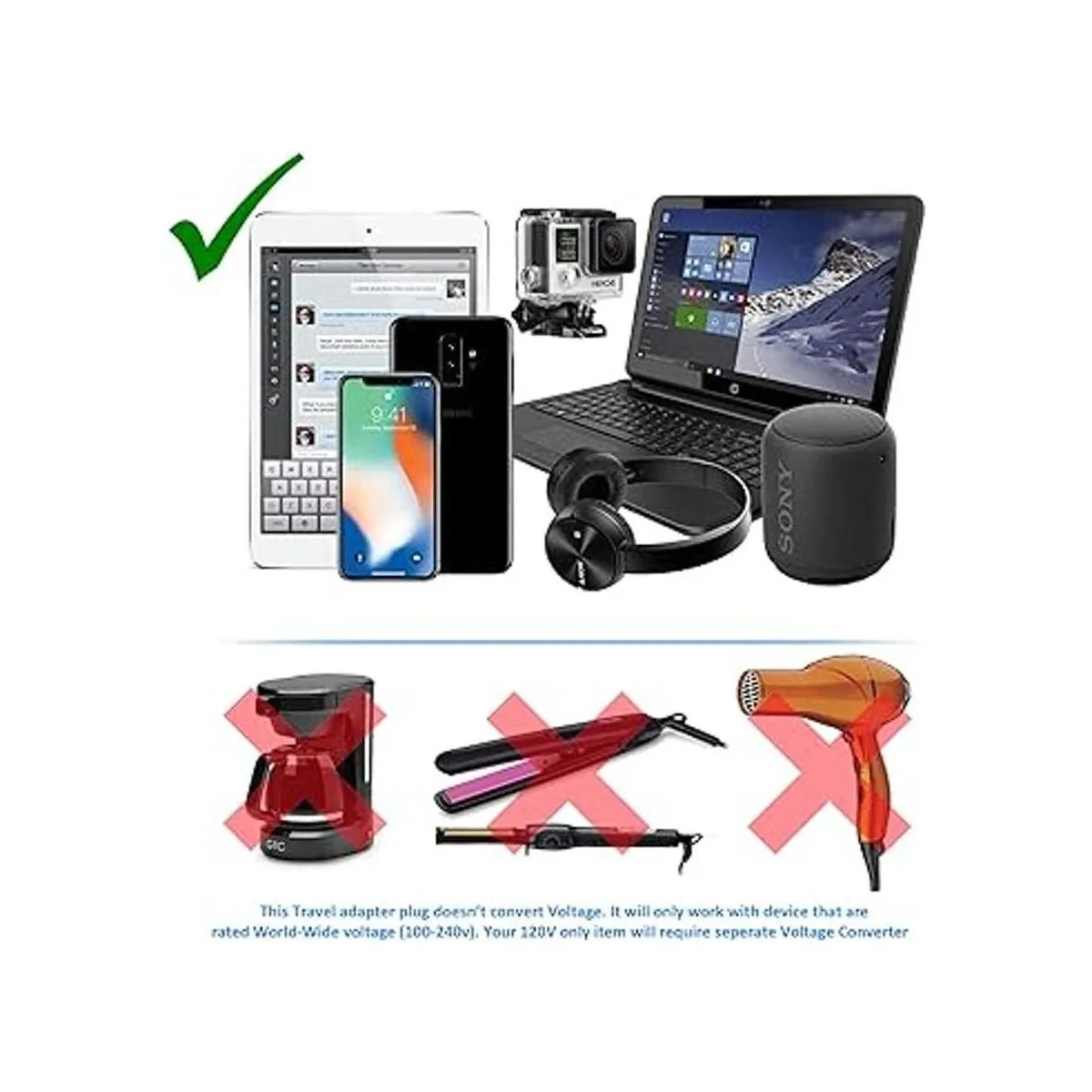 Importante: este es solo un adaptador de viaje, no funcionará con dispositivos que requieren un convertidor de voltaje. Solo funcionará con productos de doble voltaje como teléfonos celulares, cargadores y portátiles, etc.