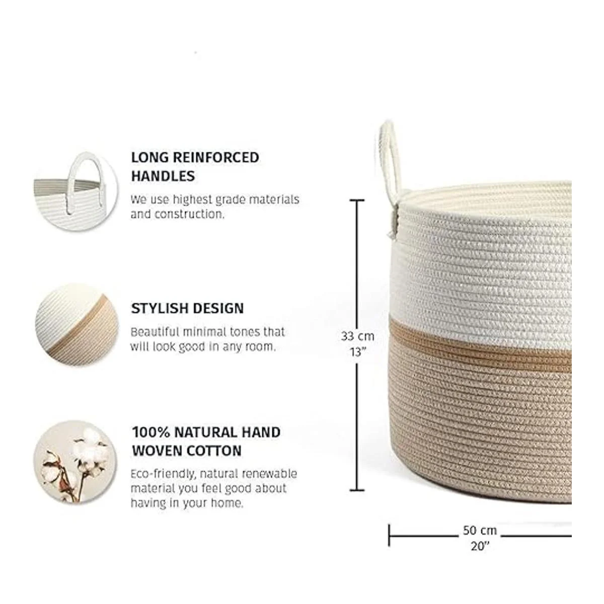 Algodón natural para el aspecto especial que solo esta fibra renovable puede proporcionar. Saludable con ninguno de los aditivos nocivos y revestimientos que se encuentran en otras cestas de mimbre. Mucho más acogedor y refrescante que el plástico. Están hechos para durar y lucir bien a través de años de uso. Te preguntarás cómo has vivido sin ellos