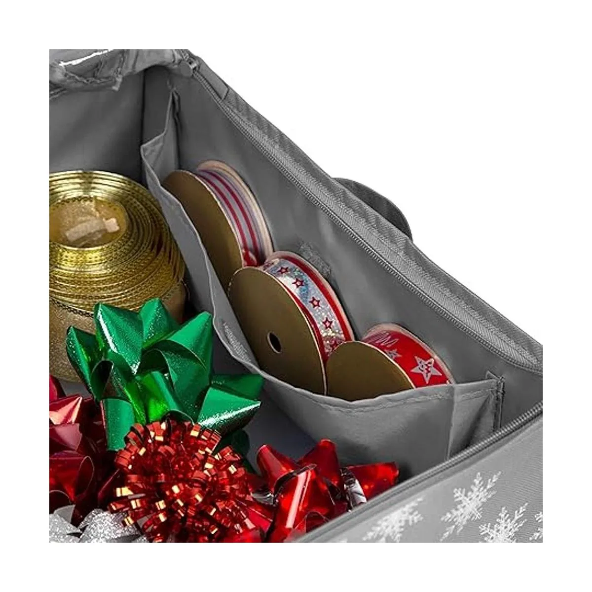 STAY ORGANIZED WITH AN ALLINONE HOLIDAY WRAPPING SUPPLY CONTAINER: If youve been looking for a place to store and keep all of your holiday supplies in one place after the holidays or someplace to store birthday and special occasion wrapping supplies then your search is over Grey snowflake design for Christmas cheer, our product has two deep pockets and plenty of space for your ribbons, tools, and tape which means that you can store your holiday wrapping supplies in one container, guaranteed