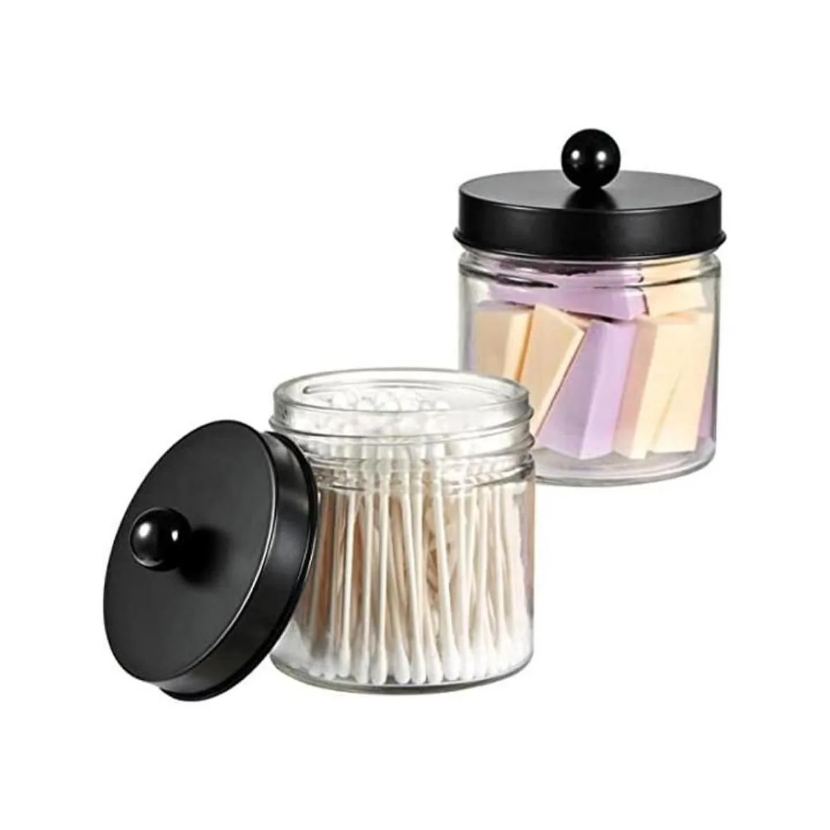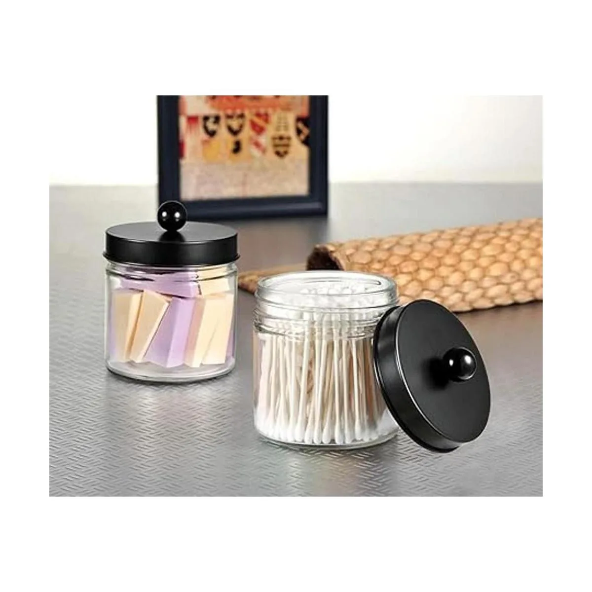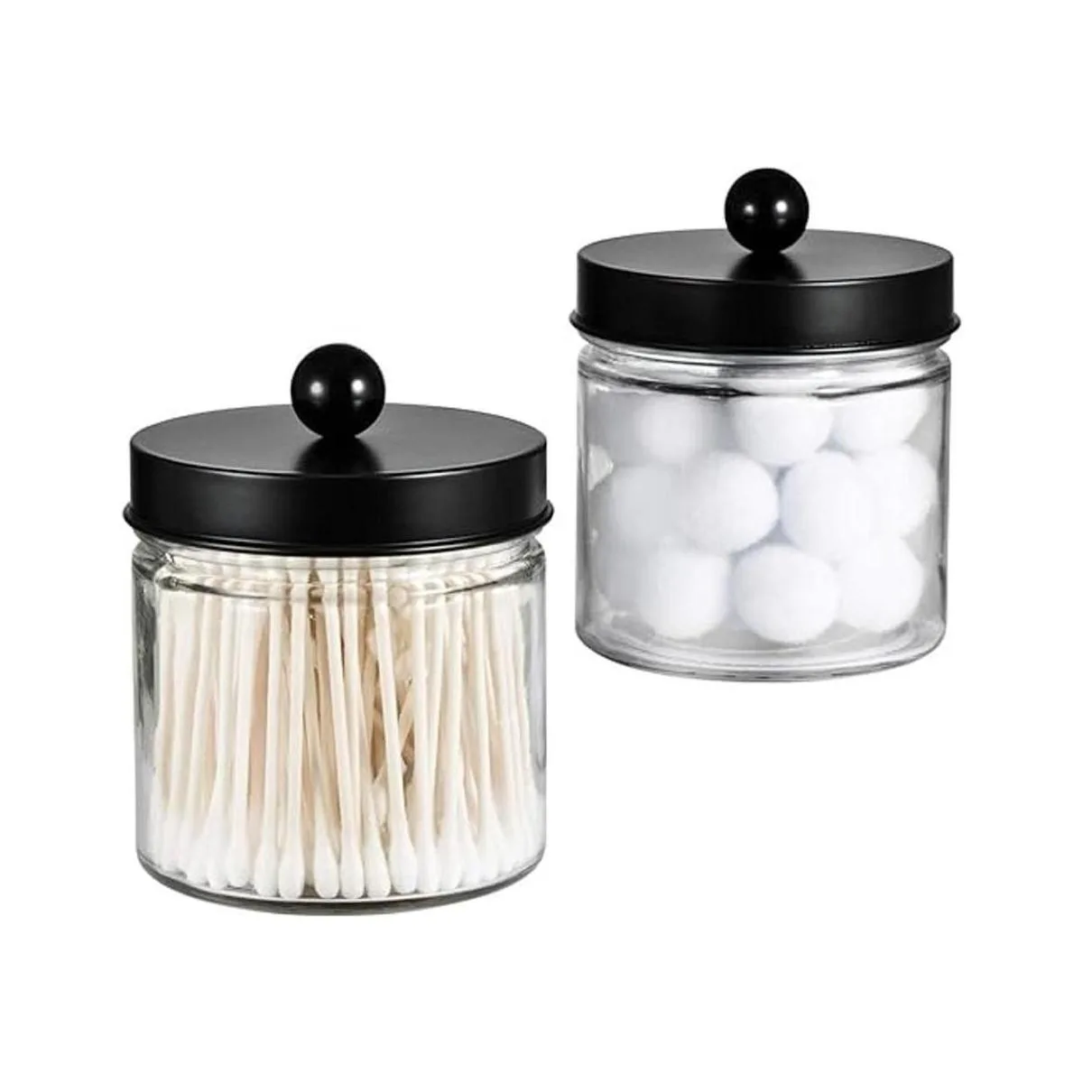 Organizador de almacenamiento de vidrio para tocador de baño, tarros de boticario para hisopos de algodón, redondos, bolas, Qtips, esponjas de maquillaje, hilo dental, sales de baño, paquete de 2, transparente negro