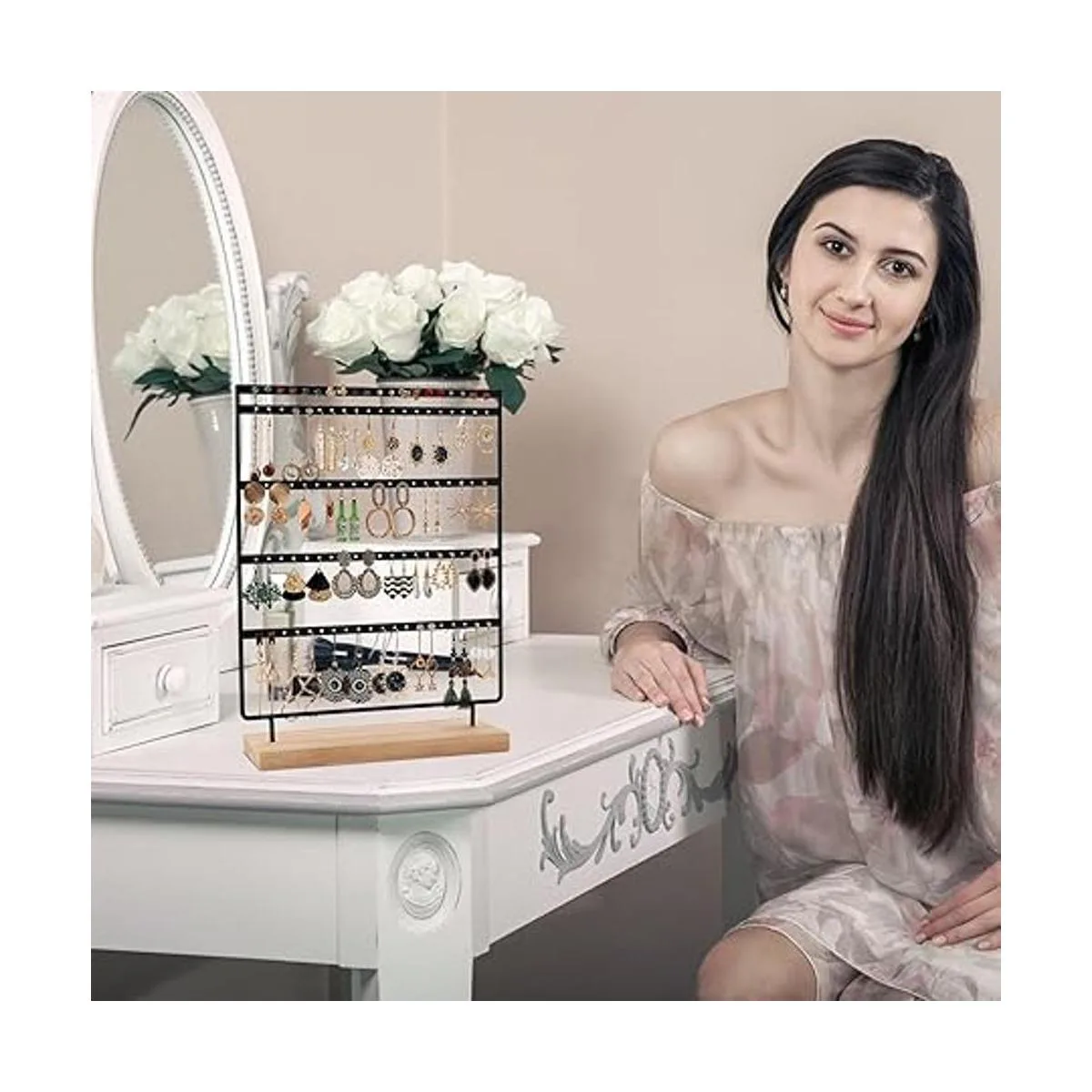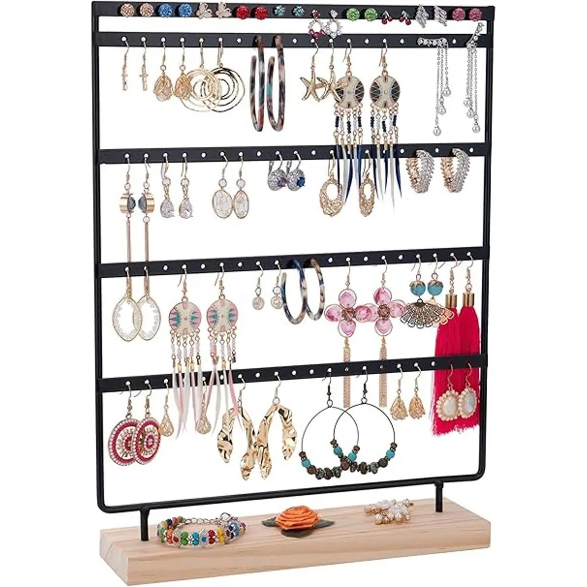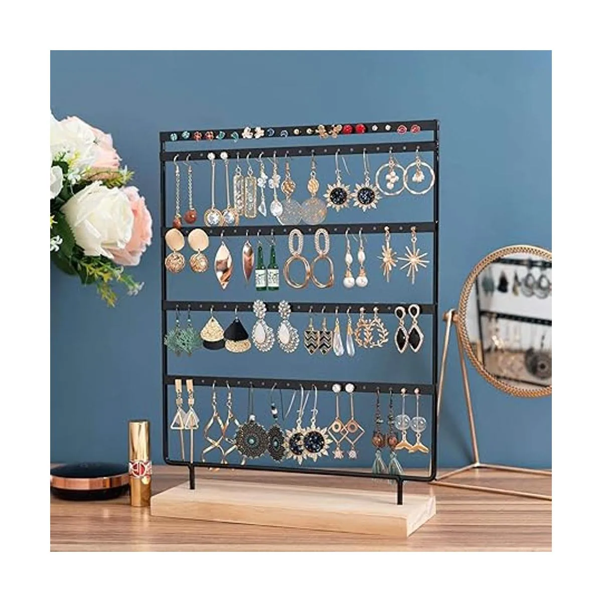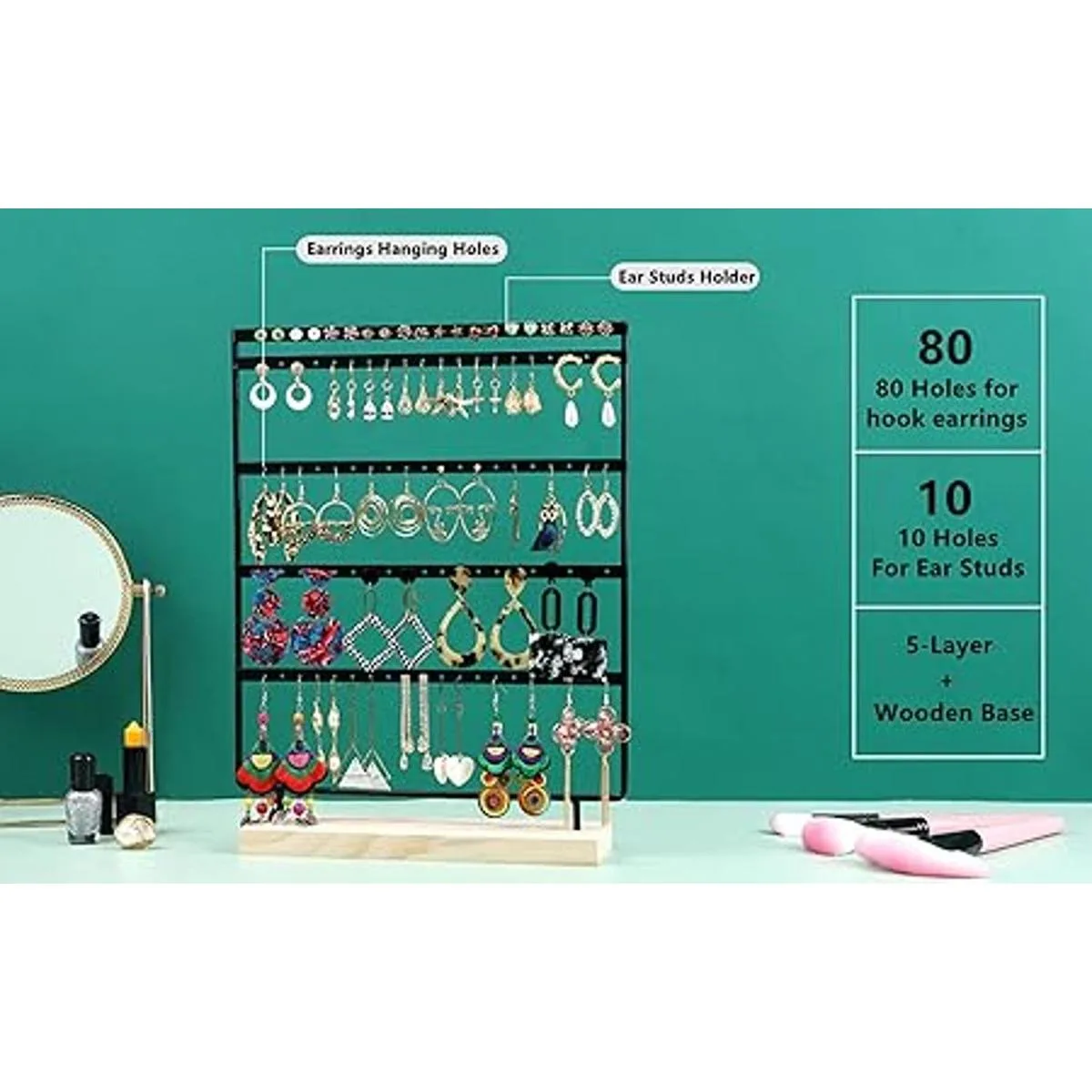 El organizador de 5 capas para aretes proporciona un espacio de almacenamiento más amplio para organizar y mostrar aretes, tachuelas, anillos, etc. Ayuda a clasificar diferentes joyas y te mantiene alejado del caótico almacenamiento de joyas.