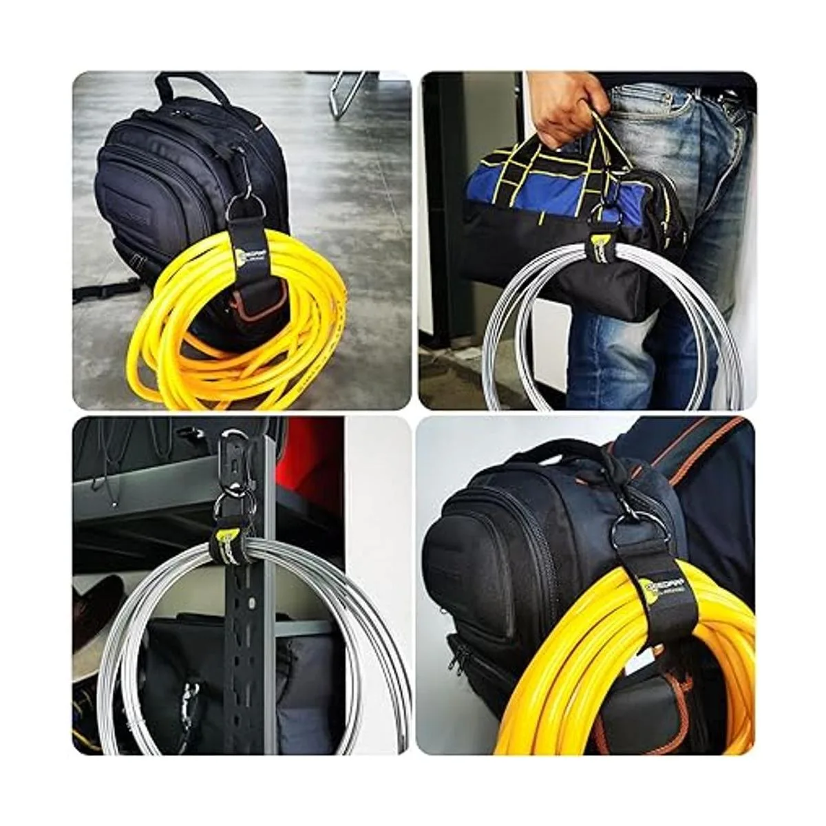 Correas multiusos con bucles ajustables: el paquete surtido de 6 incluye: 2 correas de cable de 5.5 pulgadas, 2 correas de cable de 7.5 pulgadas y 2 mosquetones. Utiliza estas correas de cordón como organizadores de herramientas de garaje, colgador de manguera de jardín, soporte de envoltura de cable y colgador de cuerda. Además, la correa se puede ajustar a la longitud deseada y te permite llevar más engranajes que los soportes de cable ordinarios