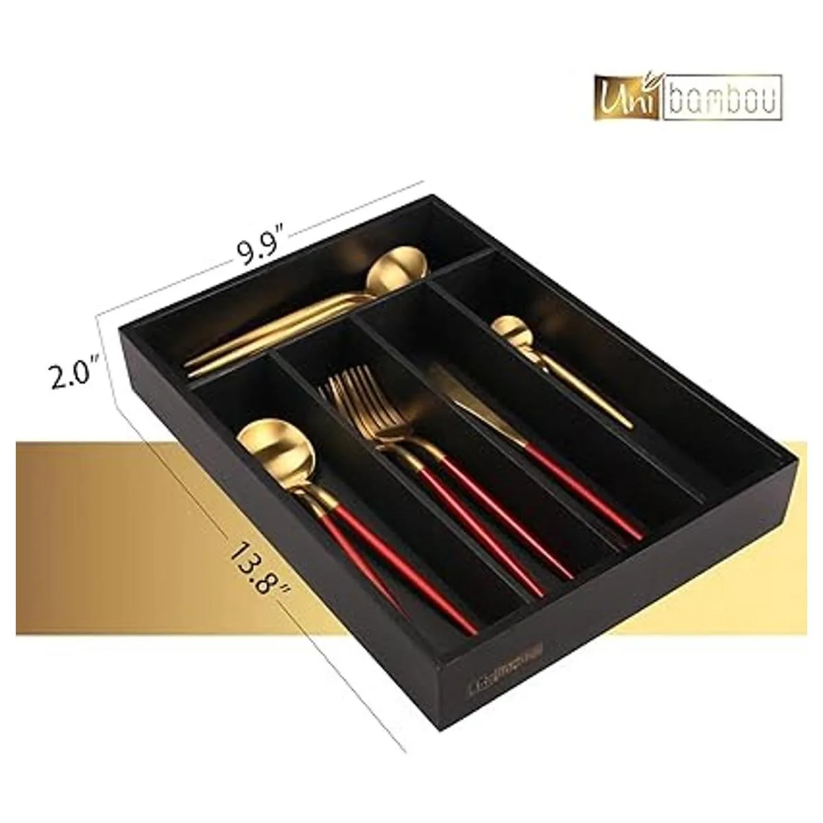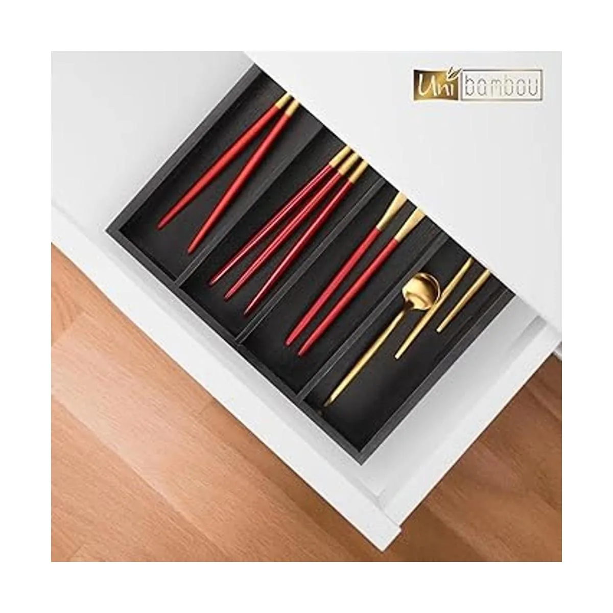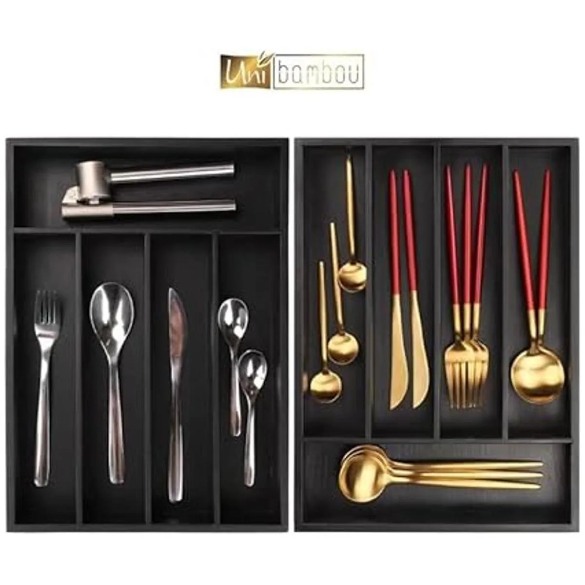 Organizador de cajones de cocina de bambú, organizador de cubiertos, bandeja de cubiertos, bandeja de utensilios, separadores de cajones y soporte de utensilios con soporte de cubiertos de madera para cubiertos 5 ranuras, negro