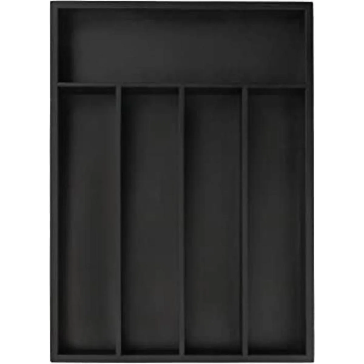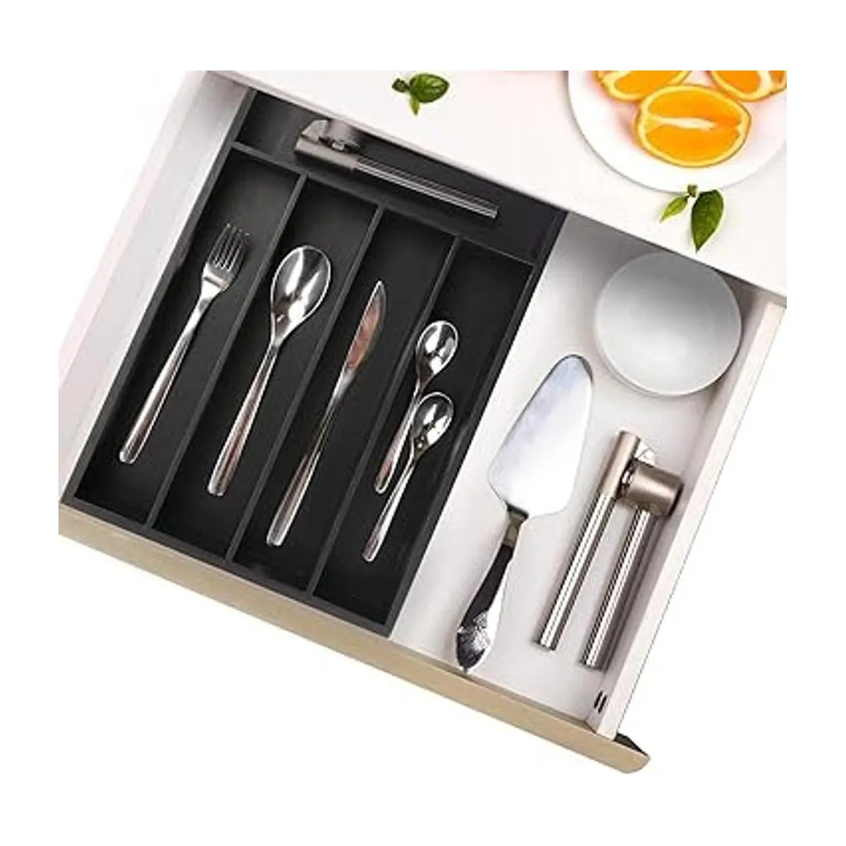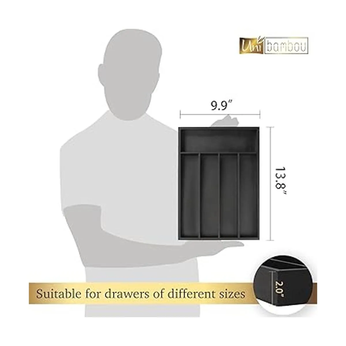 Organizador de cajones de cocina de bambú, organizador de cubiertos, bandeja de cubiertos, bandeja de utensilios, separadores de cajones y soporte de utensilios con soporte de cubiertos de madera para cubiertos 5 ranuras, negro