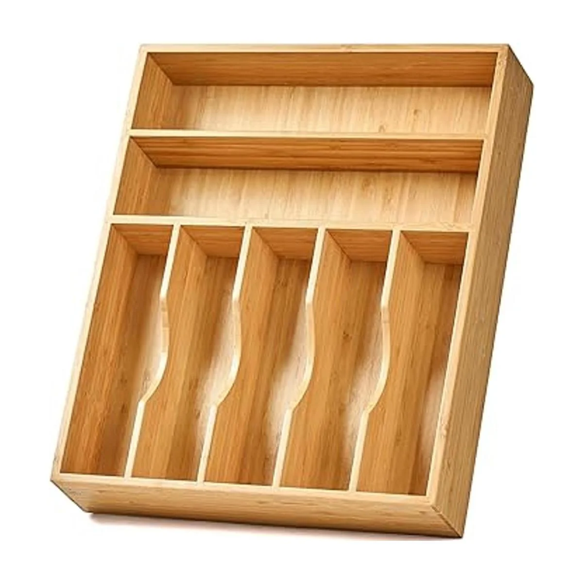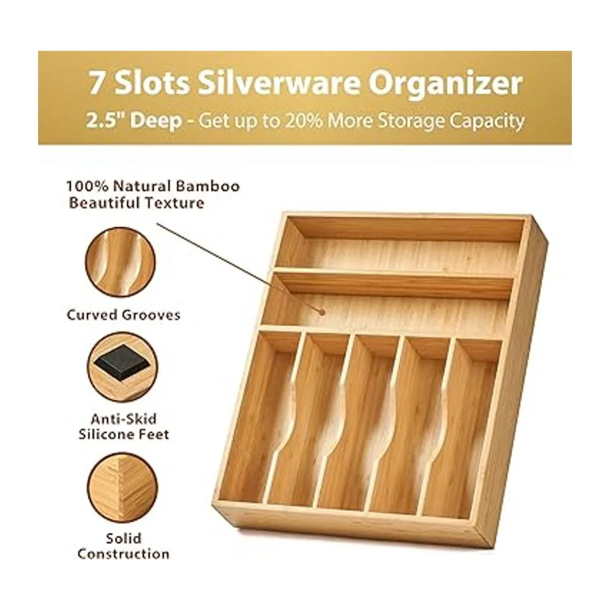 Organizador de cajones de cocina, soporte para utensilios de cubiertos de 13 pulgadas, extra profundo, con pies antideslizantes y divisor de cajones ranurado, 7 ranuras de madera de bambú total para cubiertos cuchillos, tenedores, cucharas