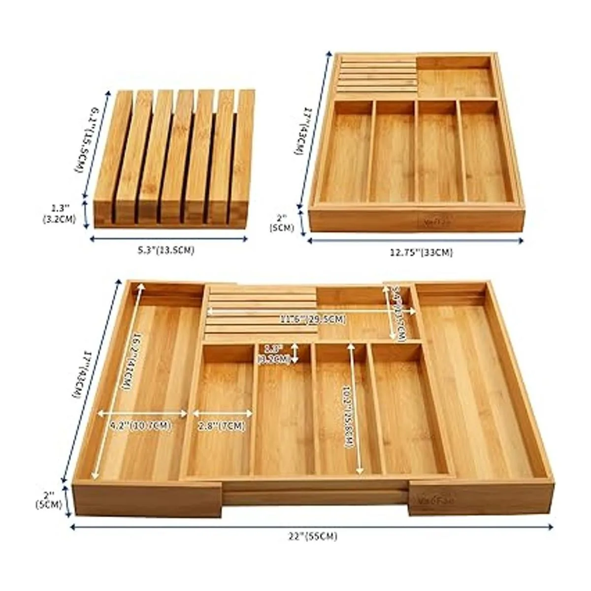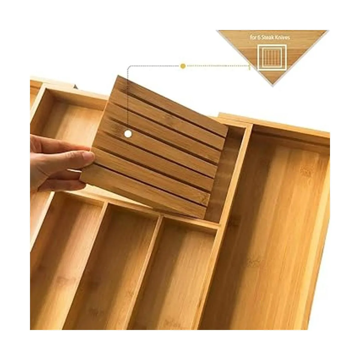 Organizador de cajones de cubiertos de bambú para cocina, soporte expandible para utensilios y bandeja de cubiertos con divisor Almacenamiento de cubiertos de 13 a 21.6 pulgadas y bloque de cuchillos extraíble