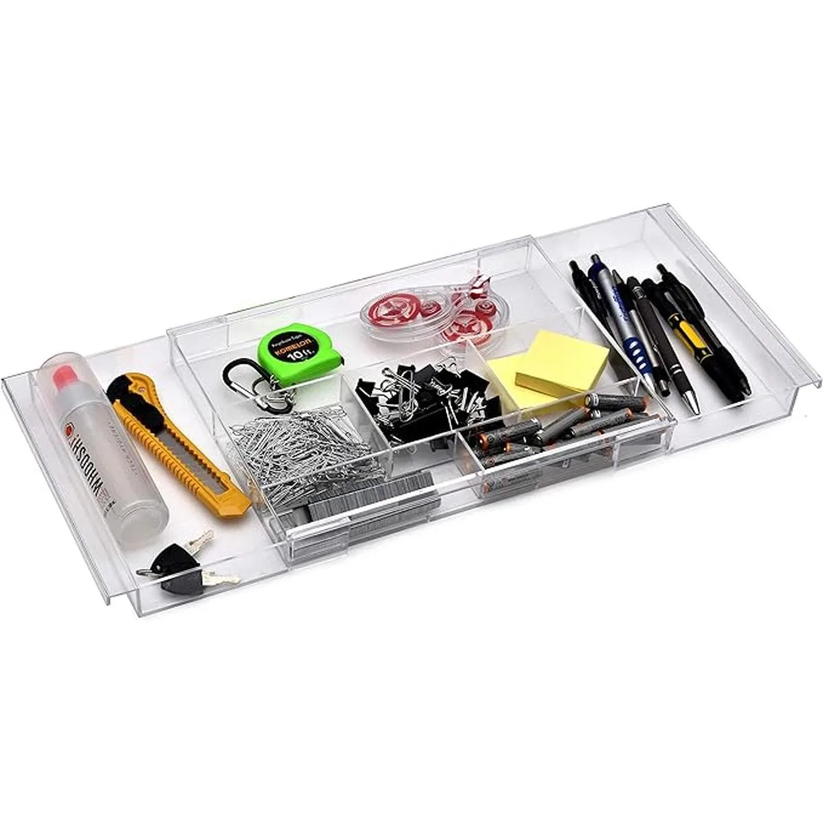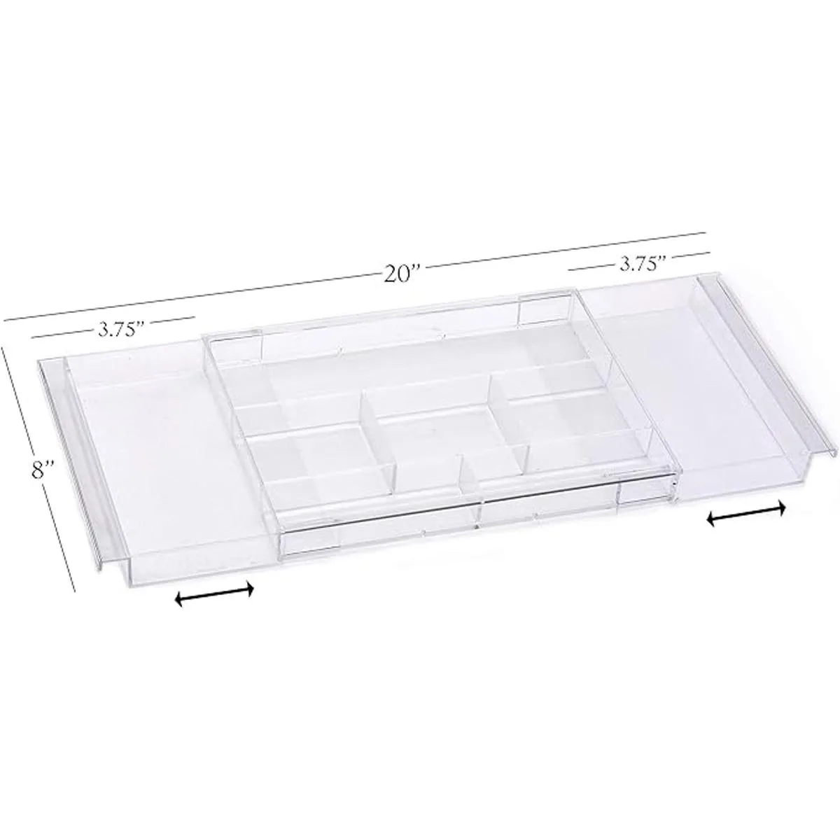 Organizador de cajones expandible Bandeja de almacenamiento de maquillaje personalizable para baño, dormitorio y cajones de escritorio, organizadores de cosméticos de plástico transparente con compartimentos expansibles juego de 2