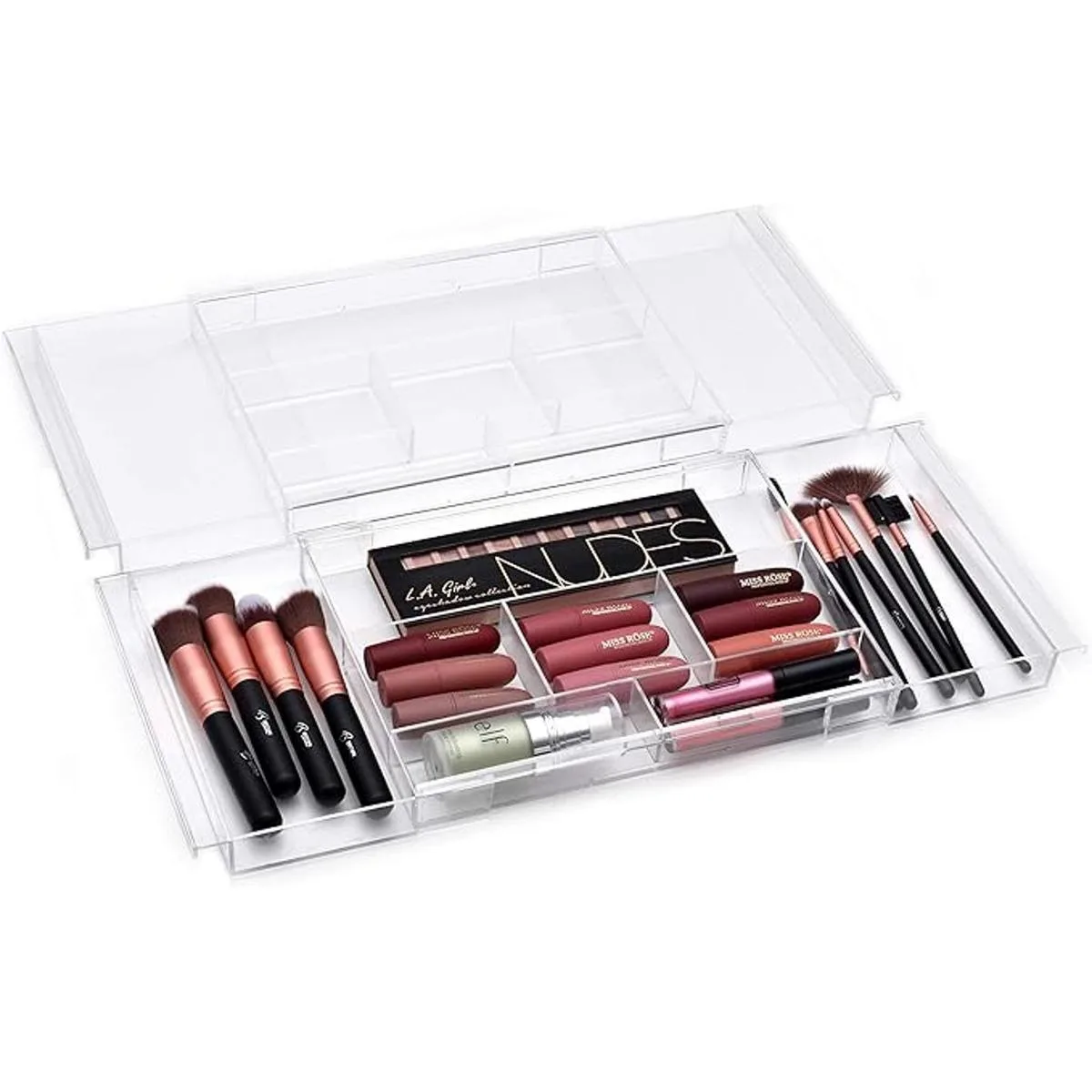 Amplíalo a tus propias necesidades y convierte cualquier cajón desordenado en un refugio de organización. Nuestro organizador de maquillaje de tocador se expande de 11 a 17 pulgadas, ajustándose así al tamaño de tu cajón y te ofrece 2 grandes compartimentos adicionales.