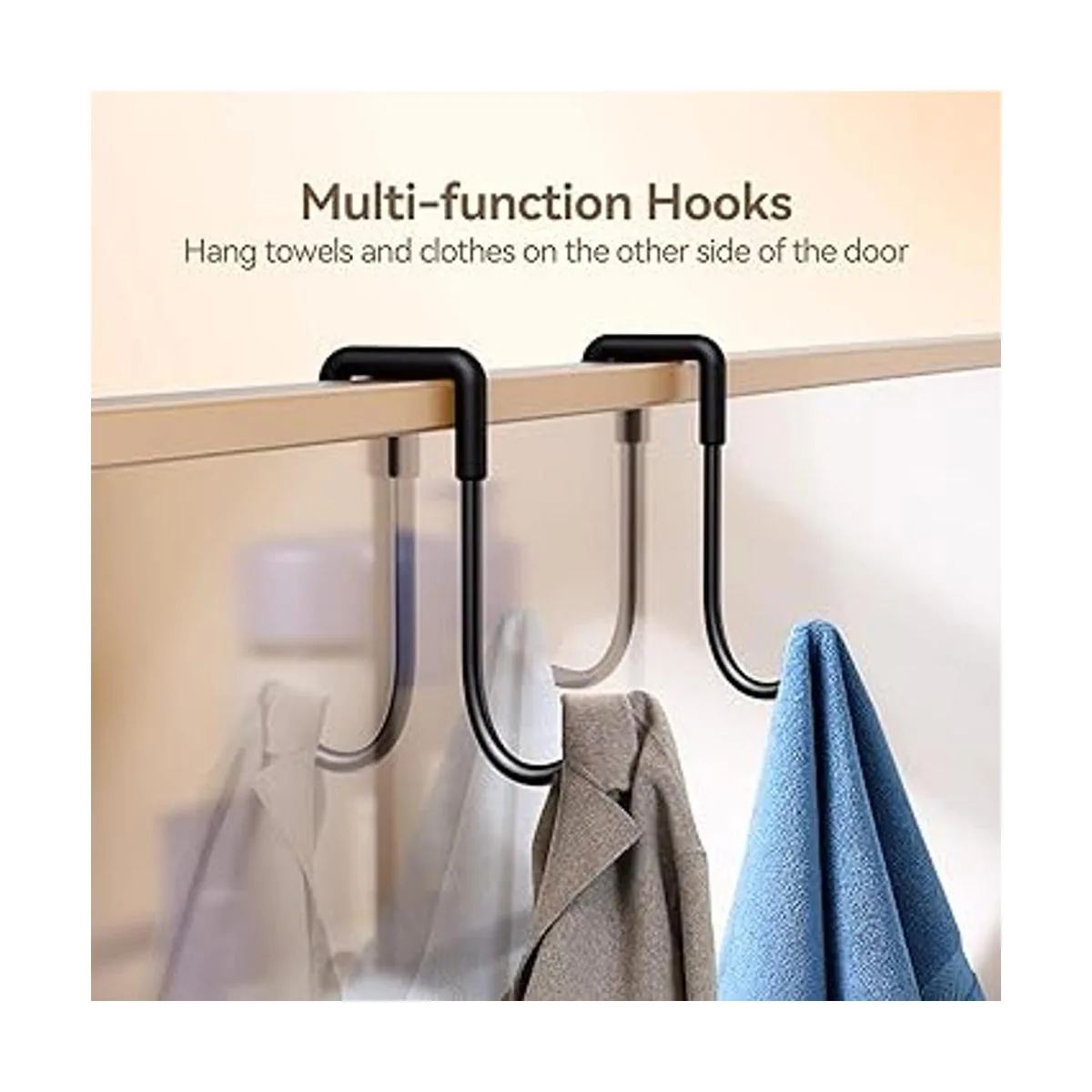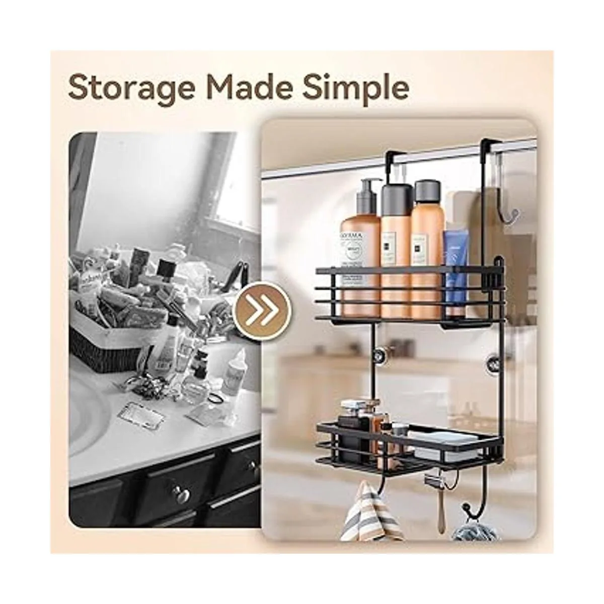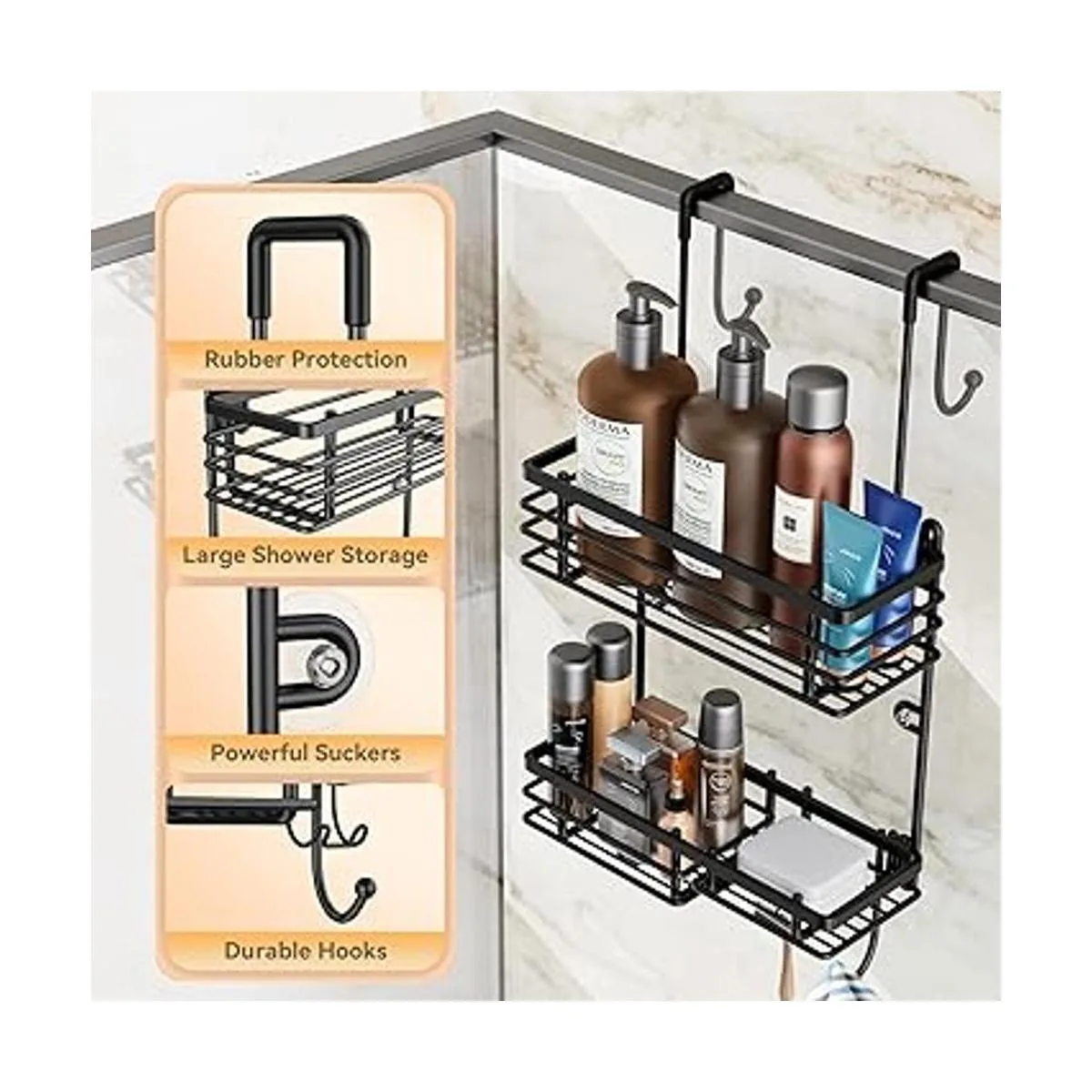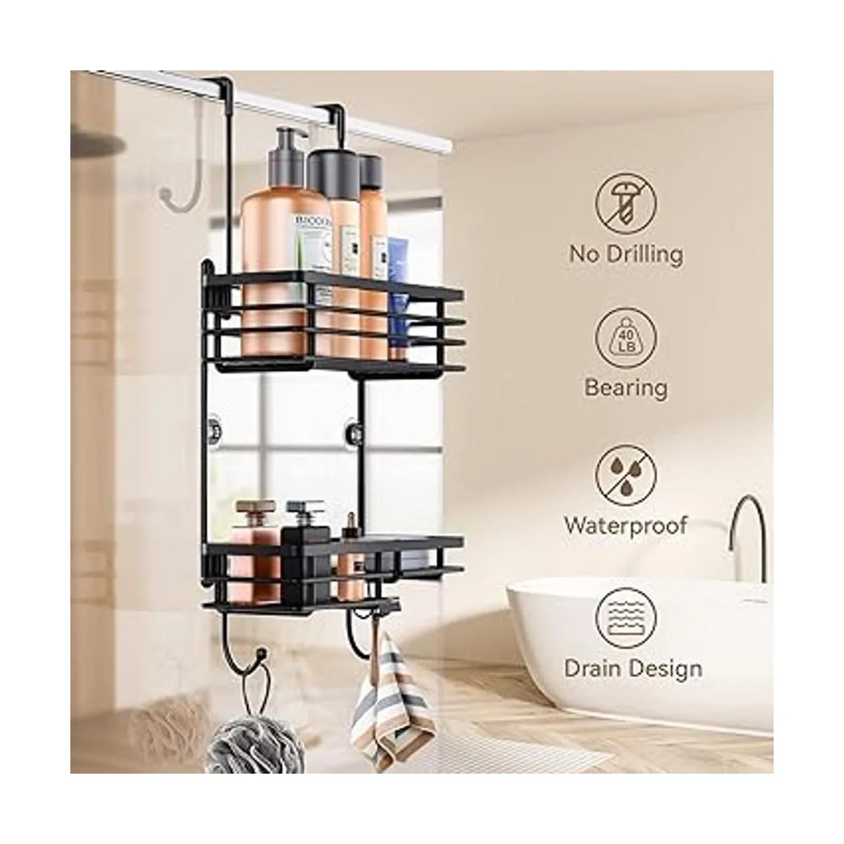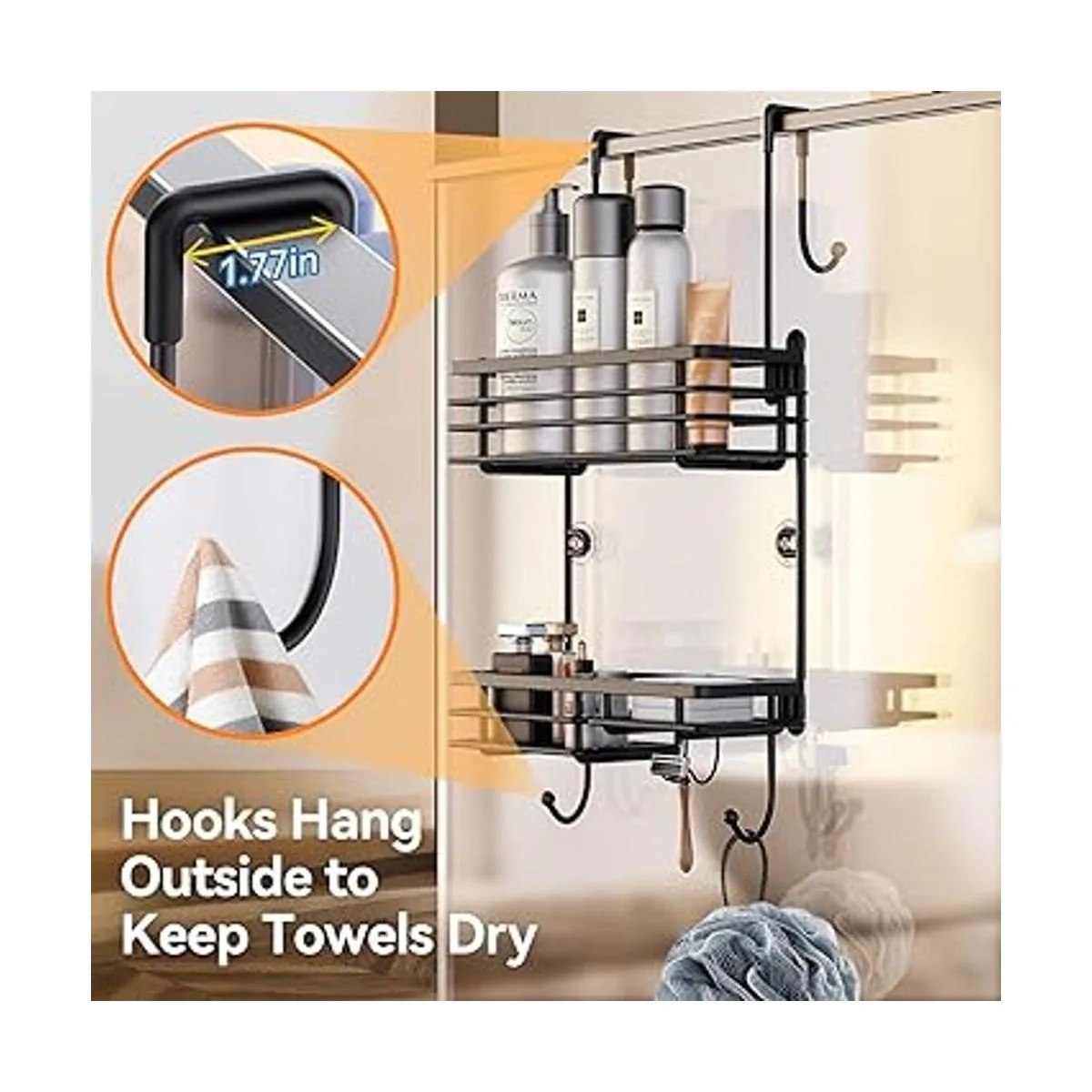 Organizador de ducha sobre la puerta de la ducha, organizador colgante de ducha, sin taladrar sobre la puerta, organizador de almacenamiento de ducha con estante y ganchos de 2 niveles, sostiene el lavado corporal, champú, jabón, maquinilla de afeitar y toalla