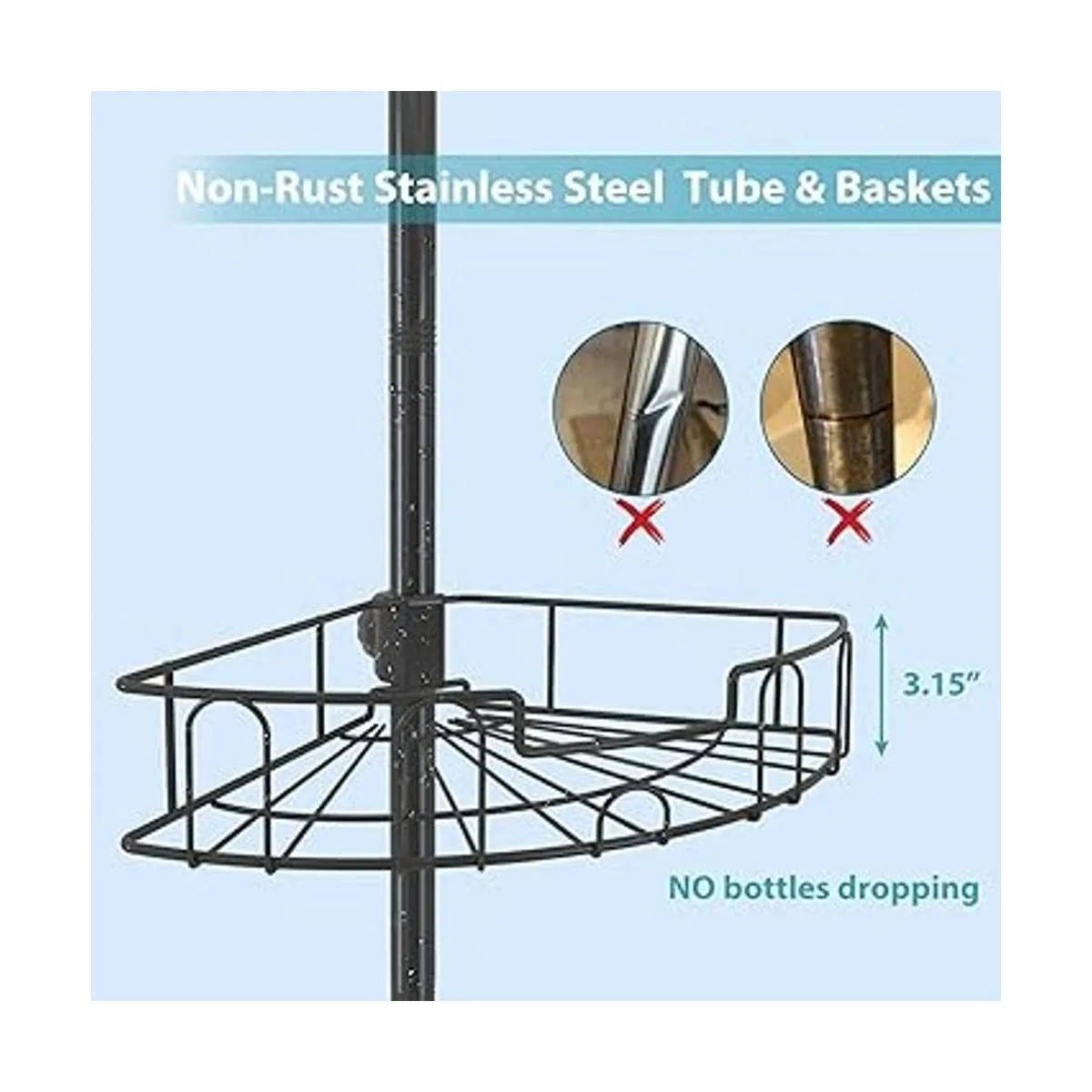 Acero inoxidable inoxidable: soporte de ducha completo fabricado en acero inoxidable, este organizador de ducha de tensión es extremadamente duradero y no se oxida ni se corroe. Resiste la prueba de más tiempo y agua más dura