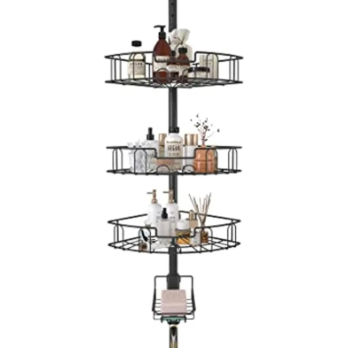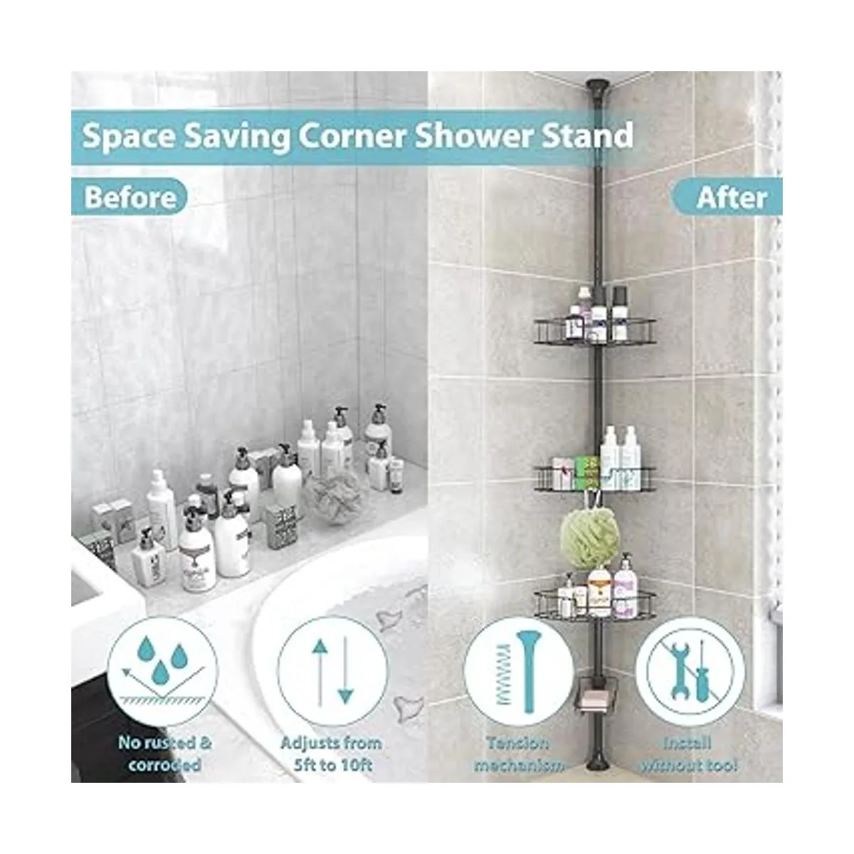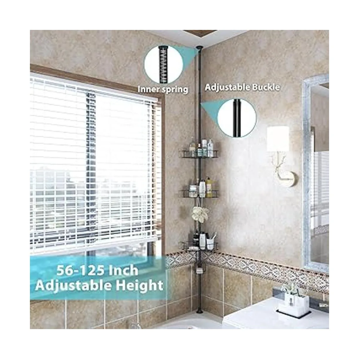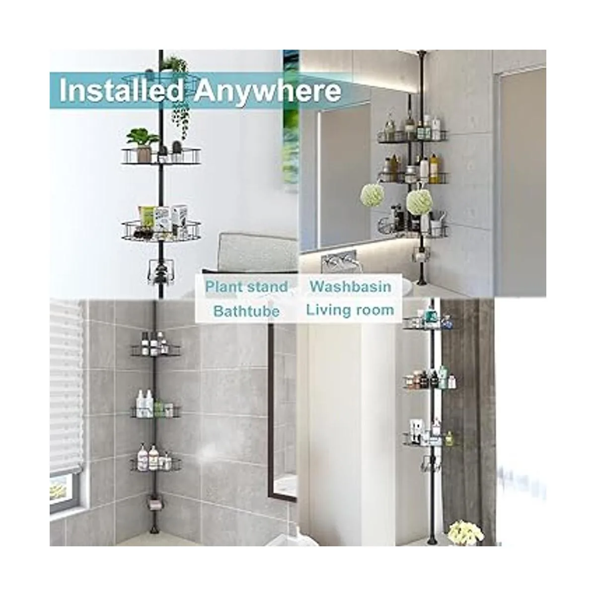 Altura ajustable: el organizador de ducha de esquina con poste de tensión tiene varias secciones para adaptarse a diferentes alturas de techo entre 4.5 pies y 10.8 pies. Parte superior con resorte para colocarlo desde el borde de la bañera hasta el techo o desde el suelo hasta el techo sin cortar. Patas de goma en la parte superior e inferior para mantener el soporte ubicado