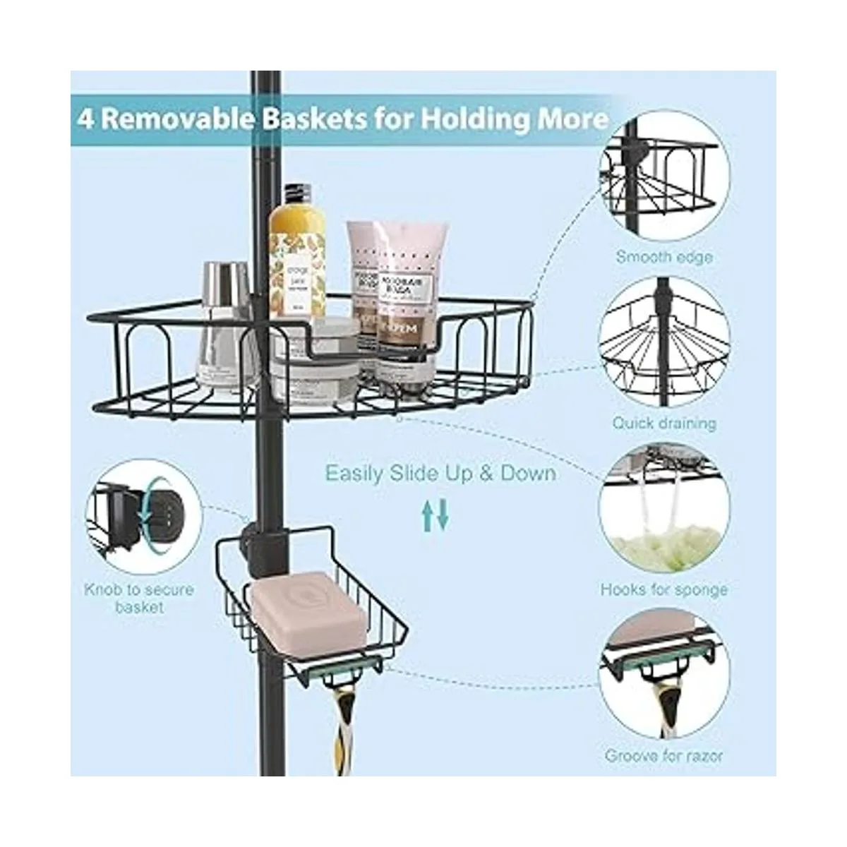 Cestas de acero inoxidable: cestas de acero inoxidable mejoradas con capacidad de 12 libras para contener todo: jabones líquidos, champú, juguetes de baño para niños, maquinillas de afeitar. También puedes colgar maquinillas de afeitar, lufas y paños con ganchos grandes abiertos de carga fuerte