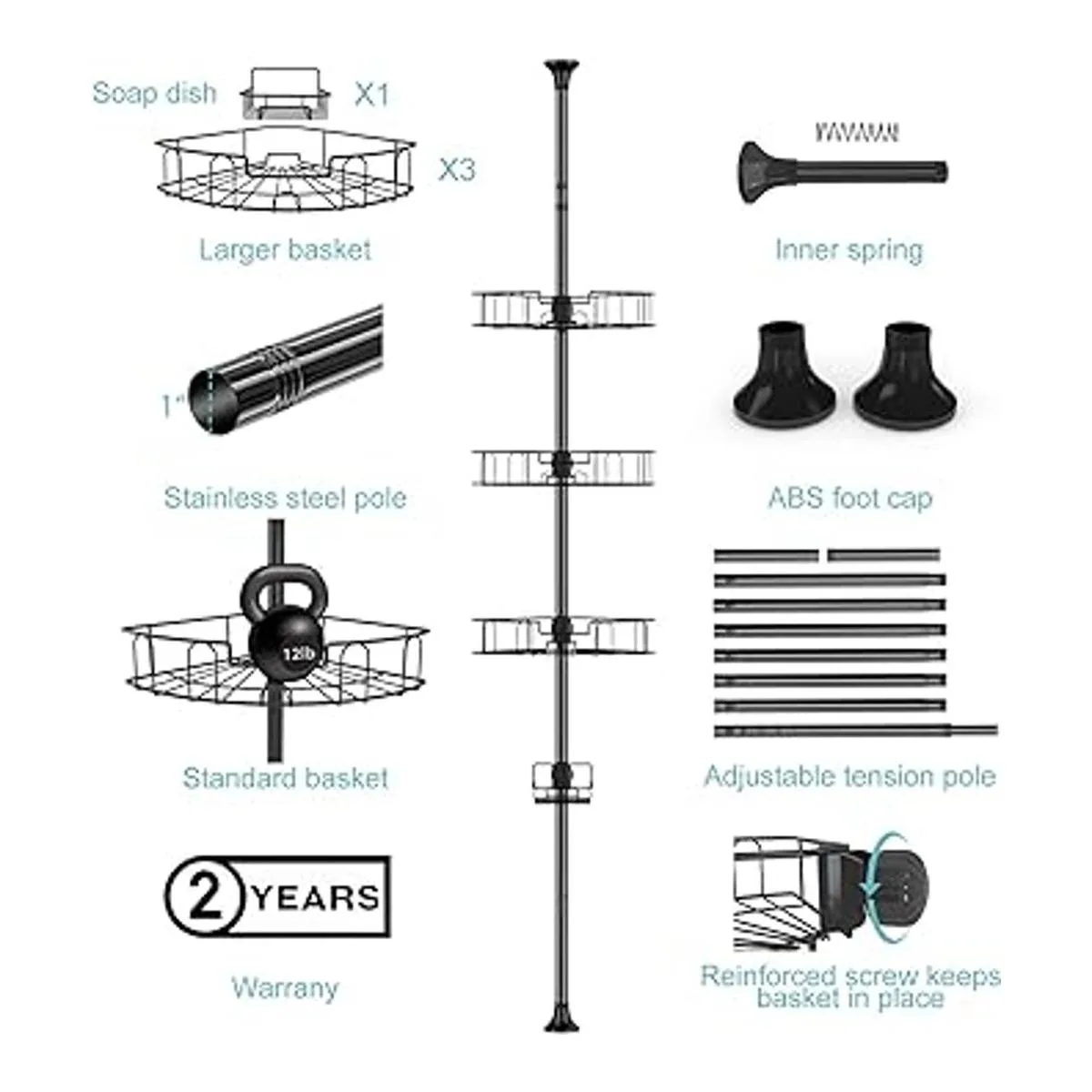 Garantía y montado en cualquier lugar: cada organizador de ducha de esquina tiene 24 meses de garantía. El reemplazo o está disponible una vez que nos envíes un mensaje. Fácil montaje sin herramientas, materiales y paredes de perforación. Mide el espacio que deseas localizar el organizador de ducha de tensión, para que puedas utilizar los postes adecuados para el área designada