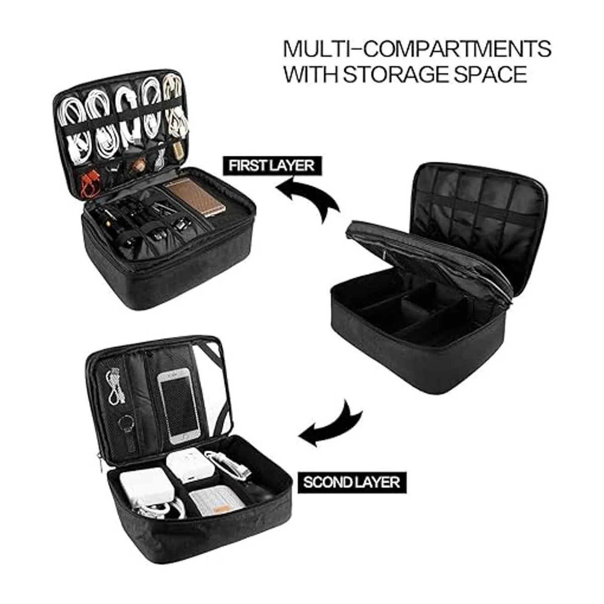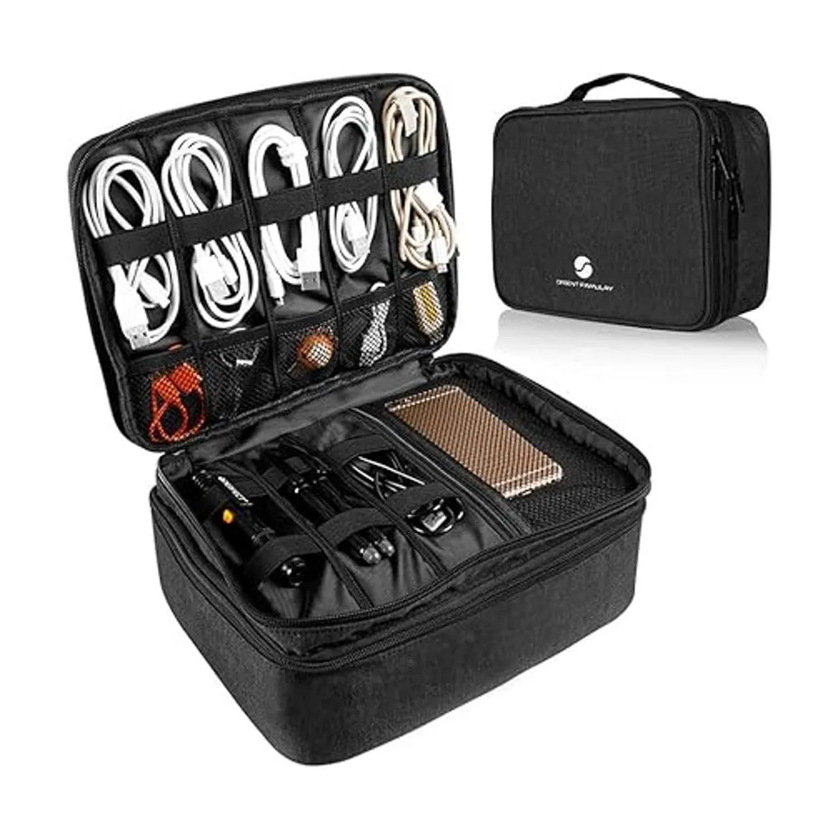 Organizador de electrónica de viaje, bolsa organizadora de cables impermeable para accesorios electrónicos, doble capa, grande, a prueba de golpes, bolsa de almacenamiento para cable, banco de energía, tableta hasta iPad 11 pulgadas, color negro