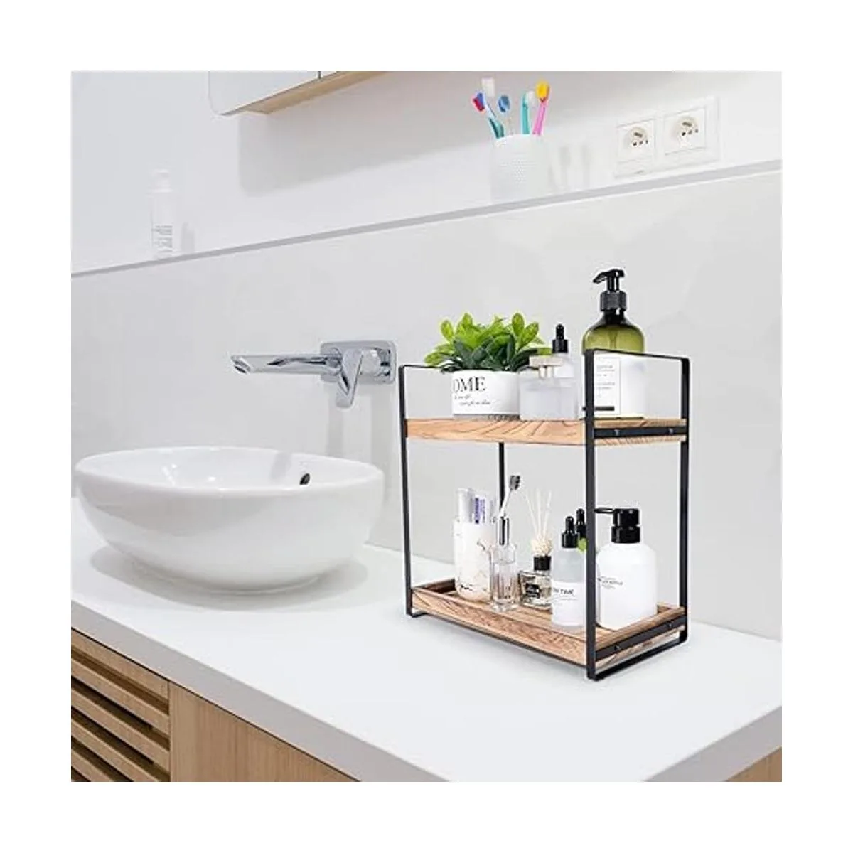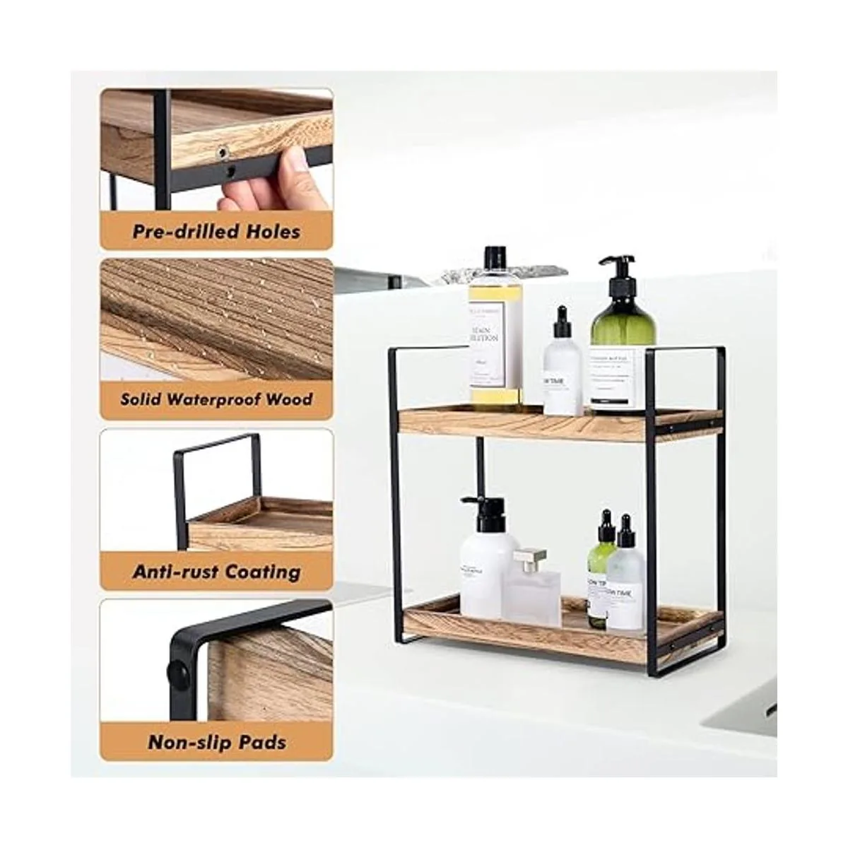 Calidad duradera y resistente: este organizador de encimera de baño está creado con madera maciza de alta calidad, cuidadosamente medido y montado para durar. Utilizamos poliuretano para sellar y proteger contra daños por agua. Y metal de alta calidad con acabado duradero resistente al óxido para un uso prolongado.