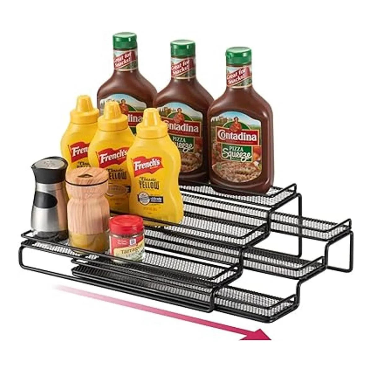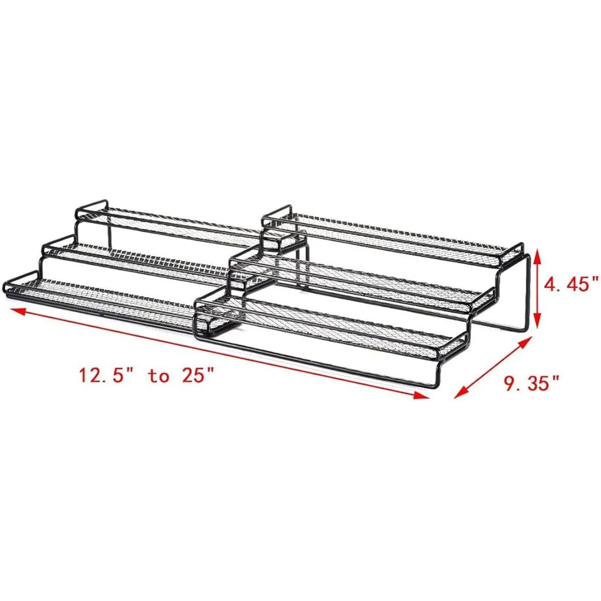 Organizador de especias de 3 niveles expandible para gabinete Estante con barra de protección 31.75 cm a 63.5 cm de ancho, color negro.