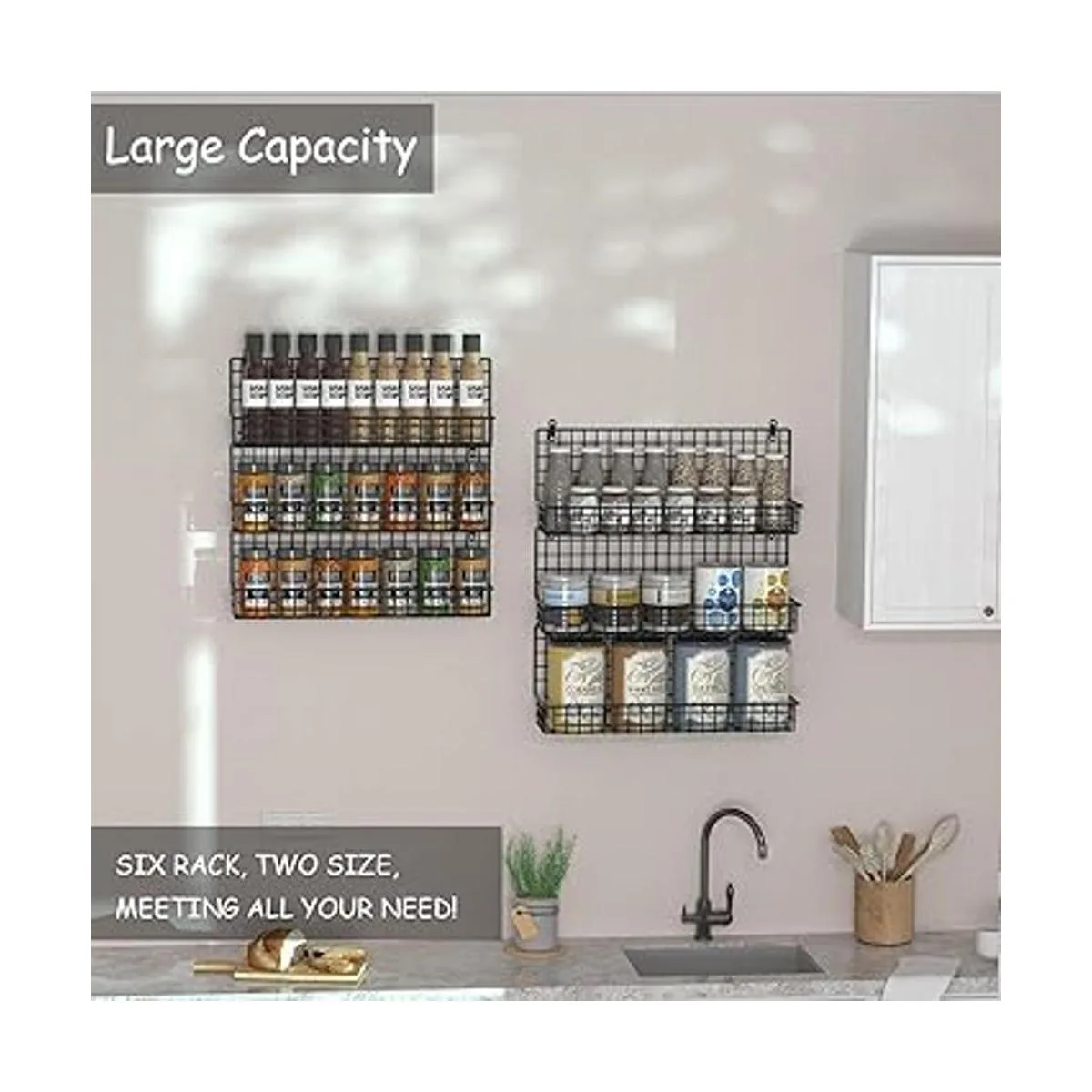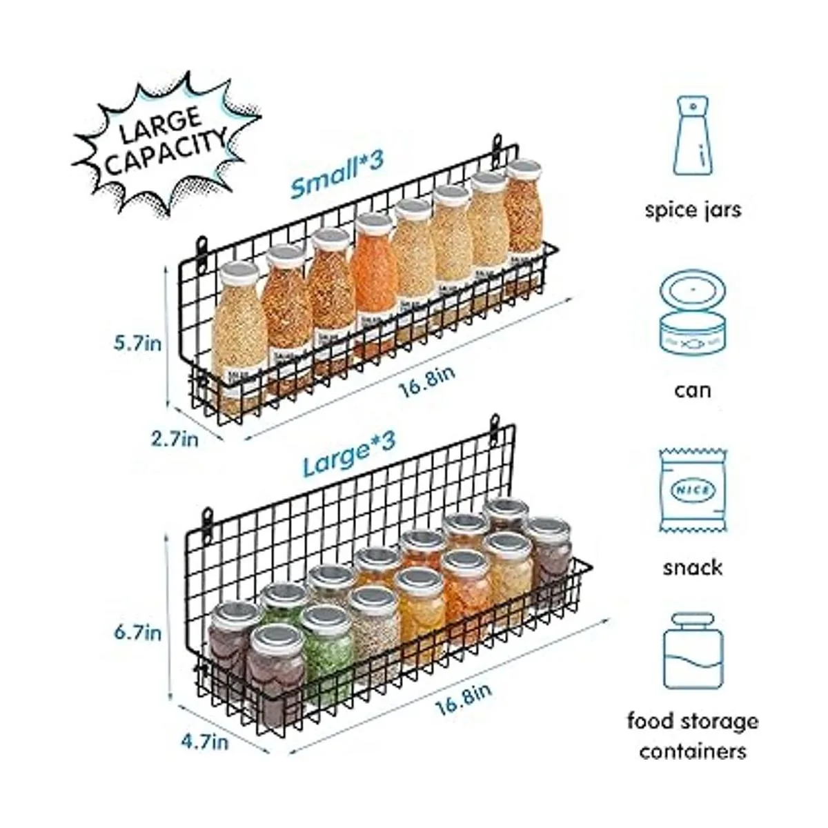 Estantes de especias resistentes y duraderos: nuestros estantes de especias están hechos de alambre de hierro grueso, y la superficie está tratada con revestimiento de polvo negro, que no solo es duradero, sino también resistente al óxido. Contiene herramientas de instalación e instrucciones idioma español no El paquete contiene 6 estantes, 3 especieros de tamaño pequeño y 3 especieros de gran tamaño. Tamaño pequeño: 16.8 pulgadas de largo x 2.6 pulgadas de ancho x 5.7 pulgadas de alto. Tamaño grande: 16.8 pulgadas de largo x 4.7 pulgadas de ancho x 6.7 pulgadas de alto