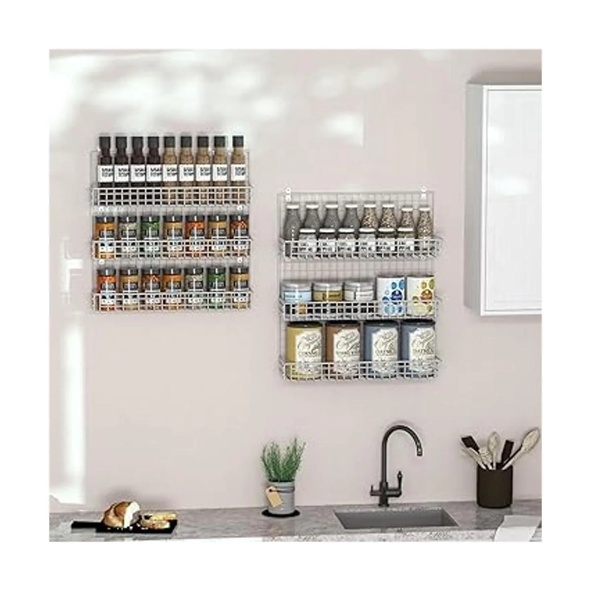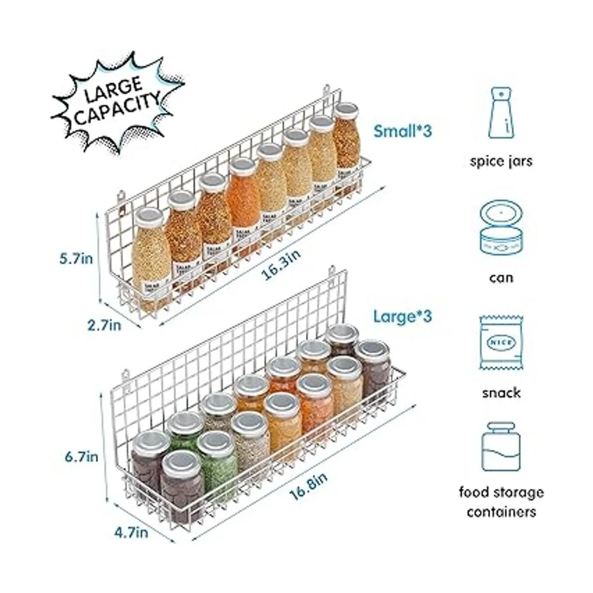 Estantes de especias resistentes y duraderos: nuestros estantes de especias están hechos de alambre de hierro grueso, y la superficie está tratada con revestimiento de polvo plateado, que no solo es duradero, sino también resistente al óxido. Contiene herramientas de instalación e instrucciones idioma español no El paquete contiene 6 estantes, 3 especieros de tamaño pequeño y 3 especieros de gran tamaño. Tamaño pequeño: 16.8 pulgadas de largo x 2.6 pulgadas de ancho x 5.7 pulgadas de alto. Tamaño grande: 16.8 pulgadas de largo x 4.7 pulgadas de ancho x 6.7 pulgadas de alto