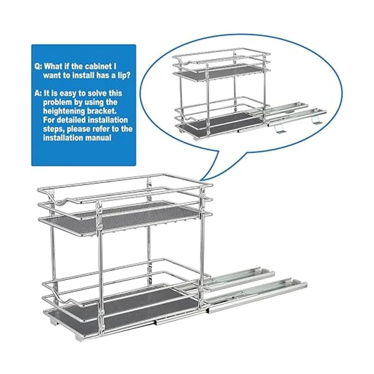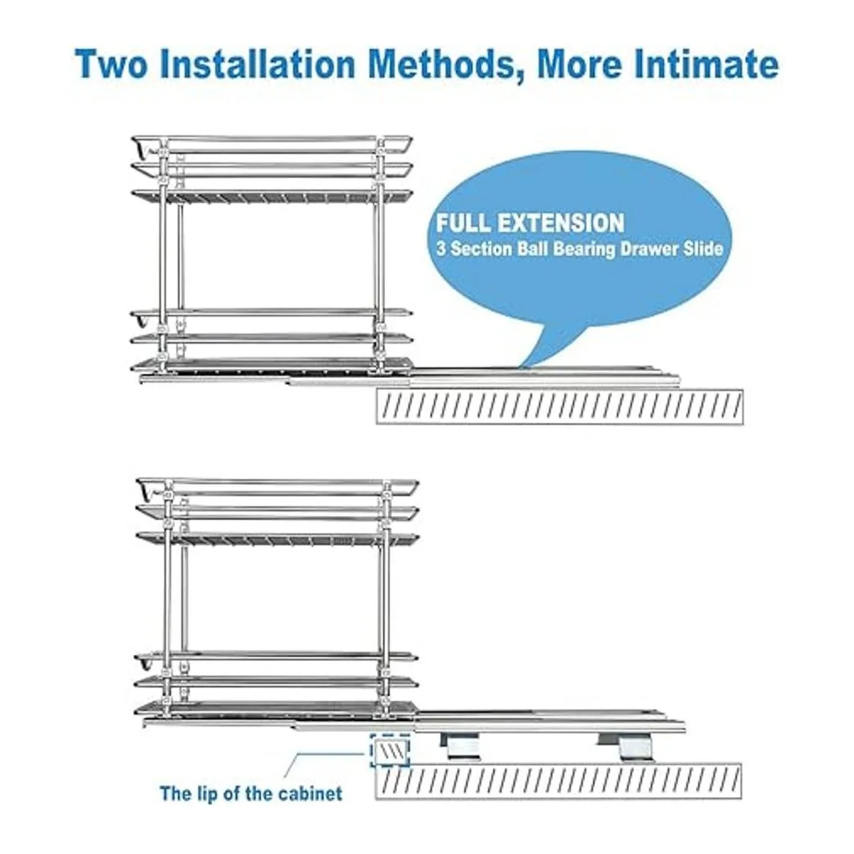 Dos métodos de instalación: según si el armario a instalar tiene un labio, elige un método de instalación diferente. El soporte inferior está diseñado para eliminar el borde del armario bloqueando que la cesta se salga. Hacemos todo lo posible para eliminar el problema de instalación.