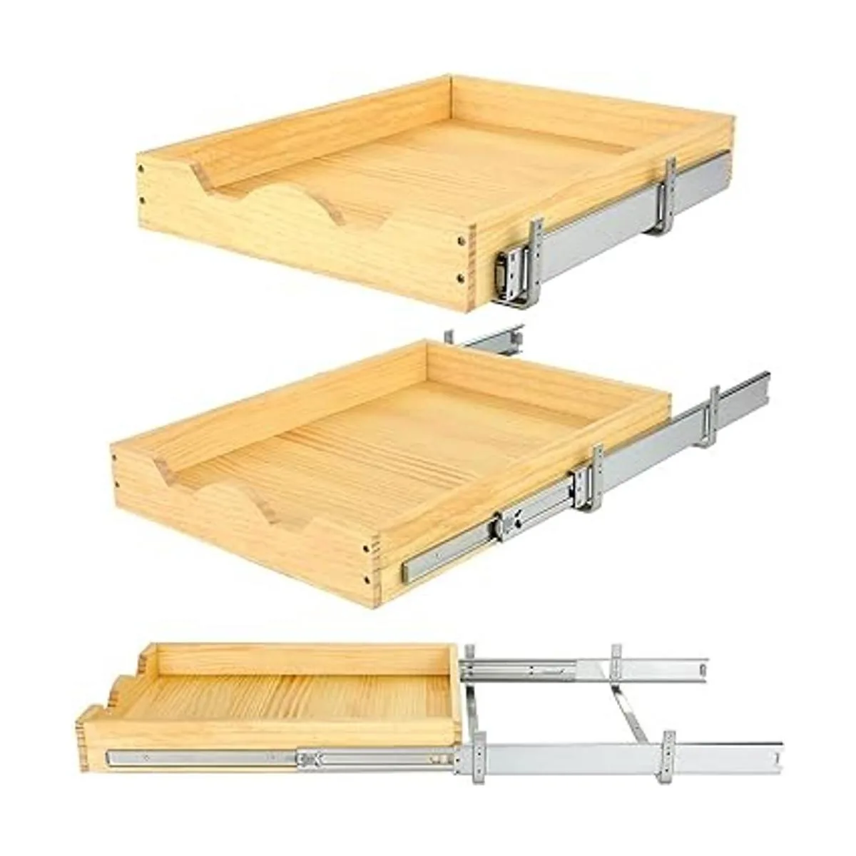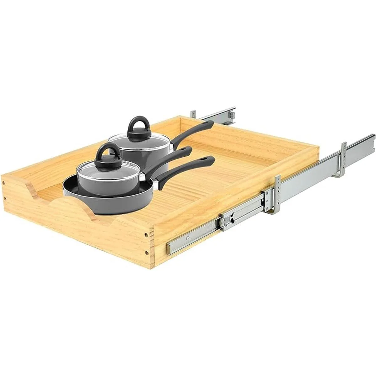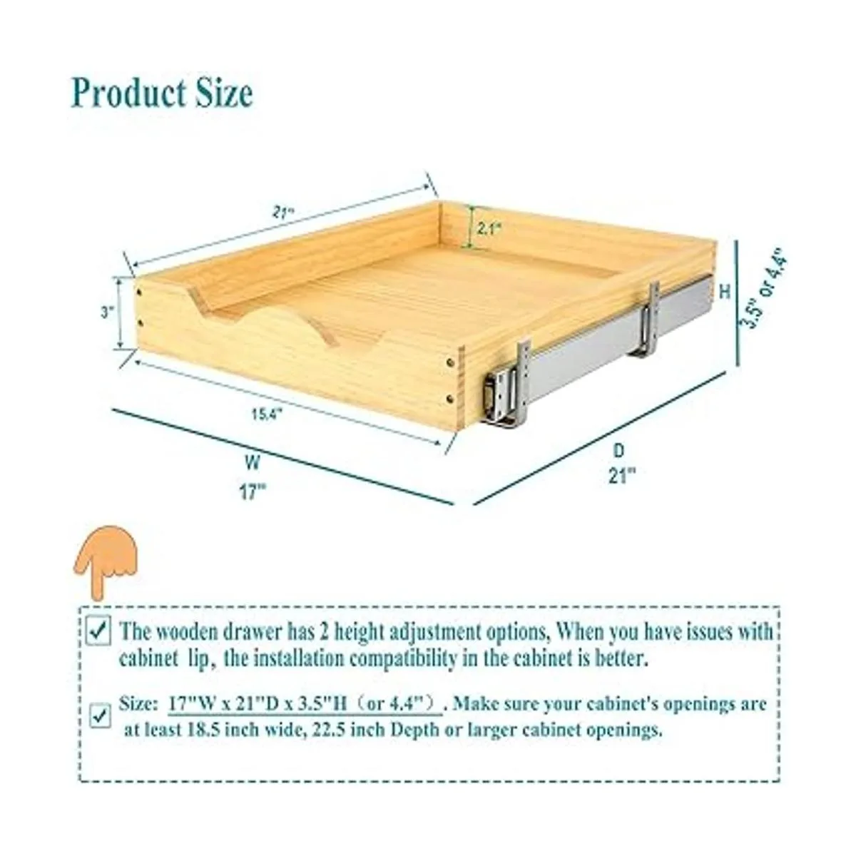Organizador de gabinete extraíble de 1 nivel 17 pulgadas de ancho x 21 pulgadas de profundidad, estante de cajón de madera deslizante de alta resistencia, cajón extraíble para gabinetes de cocina, organización de gabinete base para cocina, despensa, baño