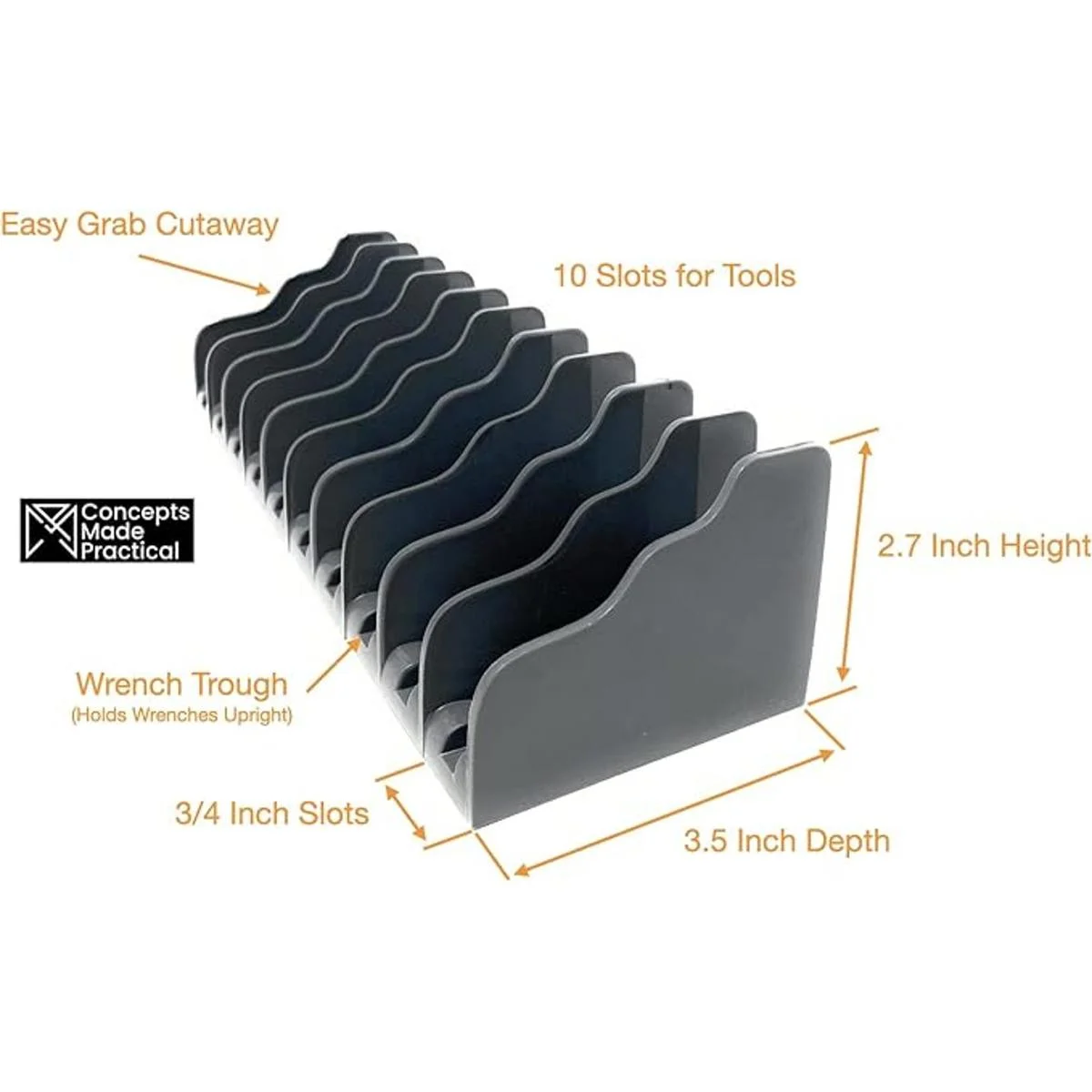 Ordena y organiza herramientas y cajones de herramientas. Capacidad para hasta 10 herramientas por organizador. Organizado verticalmente para maximizar el espacio del cajón y mejorar la accesibilidad de las herramientas.