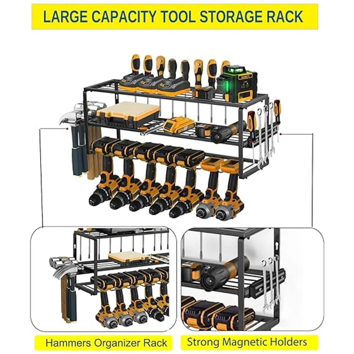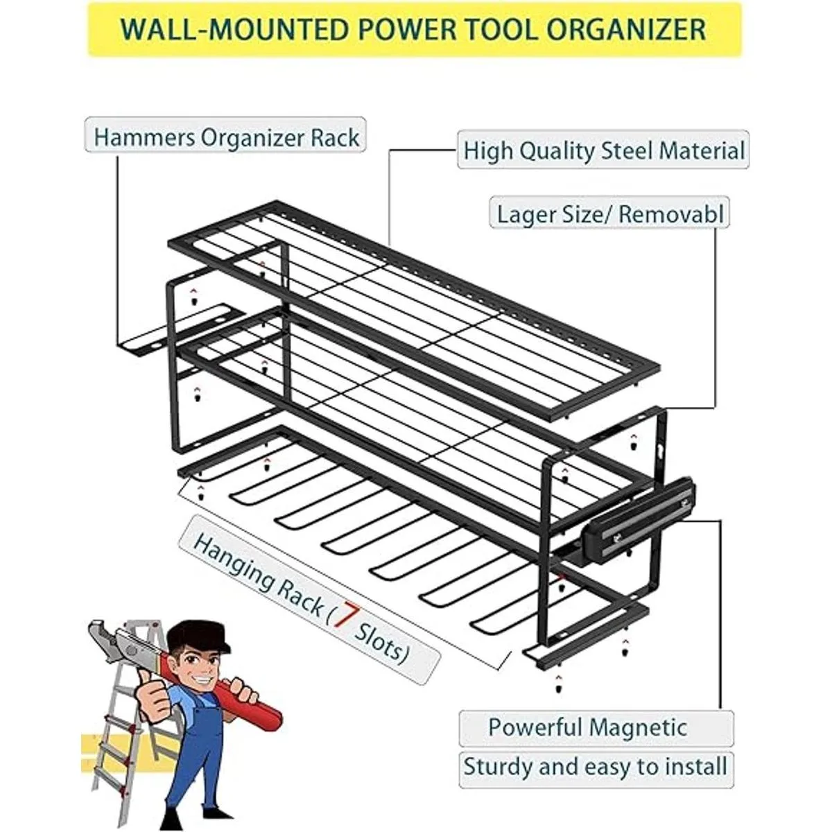 Organizador de herramientas mejorado: nuestro organizador de herramientas se ha actualizado a 7 soportes de taladros, el estante de almacenamiento de herramientas de utilidad es desmontable y tiene un gran espacio de combinación de tres niveles, el soporte de herramientas izquierdo y derecho añade espacio de almacenamiento para martillos y magnéticos, estantes de herramientas de metal y barras magnéticas para ayudarte a sostener piezas pequeñas de forma segura, te ayuda a mantener todas tus herramientas de mano organizadas, ahorra espacio y controla el desorden.