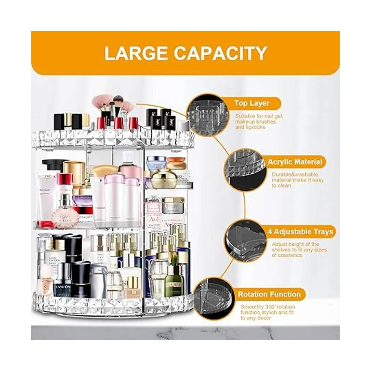 Gran capacidad Nuestro organizador de maquillaje puede almacenar alrededor de al menos 18 perfumes, 14 tóneres faciales, 12 hidratantes faciales, 8 brochas de maquillaje, 6 polvos prensados, 5 removedores de maquillaje, etc.