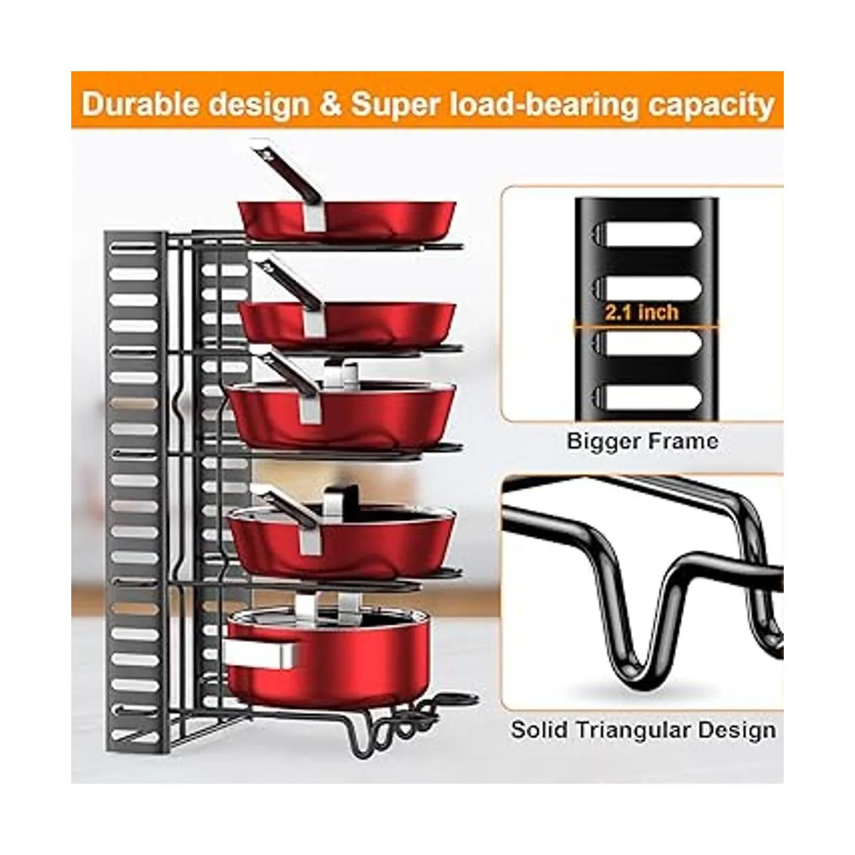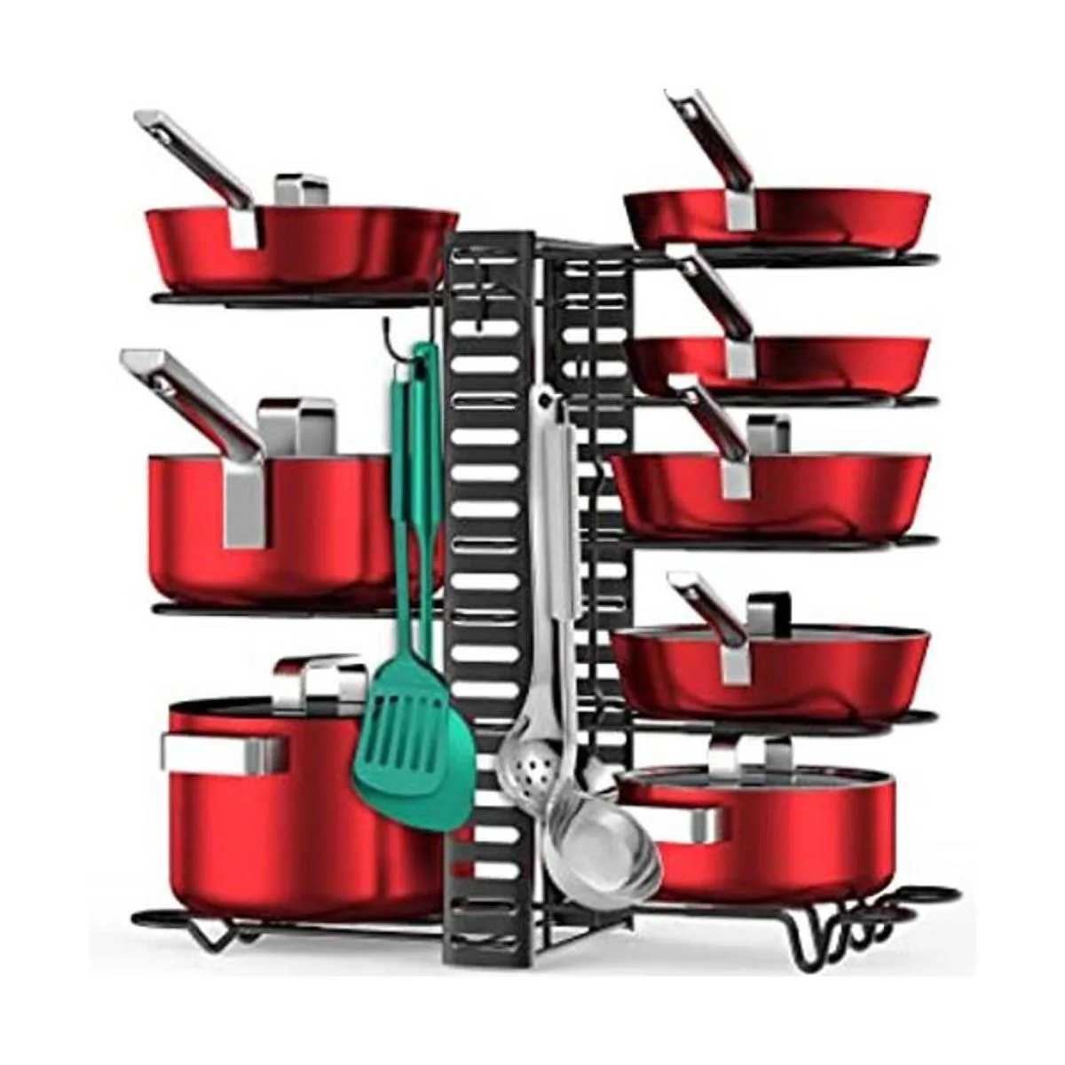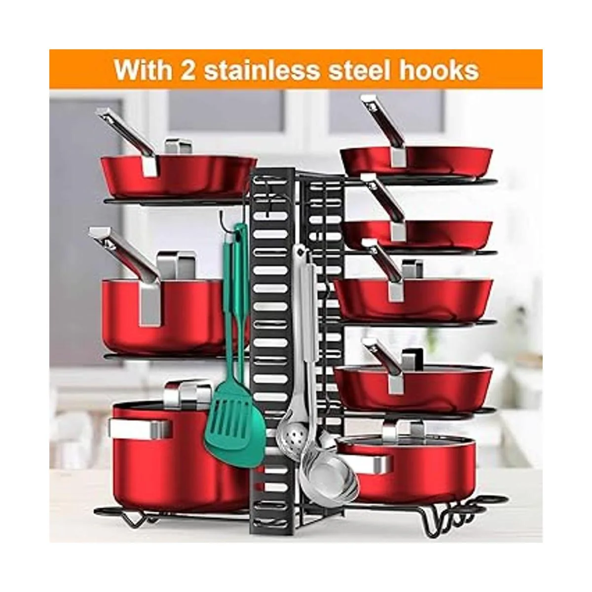 Organizador de ollas y sartenes para gabinete con 2 ganchos, estante organizador ajustable para ollas y sartenes para gabinete, 8 niveles, construcción de acero duradero, estante para ollas que ahorra espacio, almacenamiento de cocina