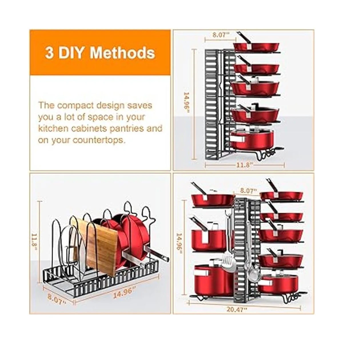 3 métodos de bricolaje: este organizador de armario es fácil de montar, puedes horizontal en un lado; vertical en un lado; vertical en ambos lados; los tamaños y la dirección de este organizador de sartenes se pueden ajustar de acuerdo a tus necesidades.