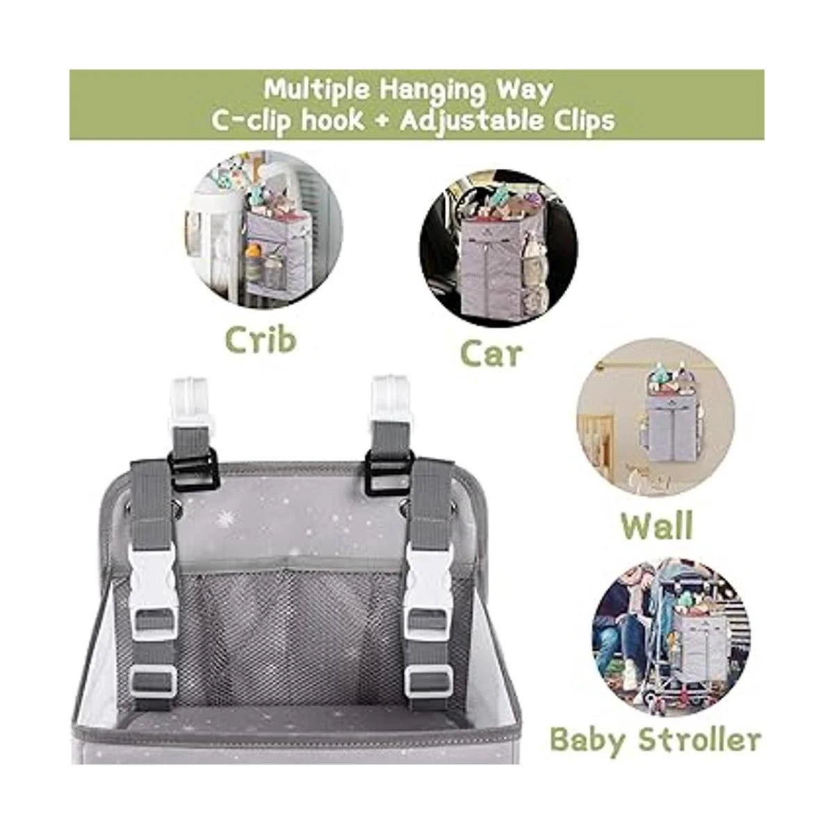 Múltiples formas de colgar: este organizador de pañales viene con 2 ganchos de clips en C que se pueden colgar en marcos de corralito. Con 2 clips ajustables duraderos, se puede colgar en cunas, cambiadores y cochecitos. Además, el diseño de agujeros de metal puede soportar que el organizador de pañales se cuelgue en la pared con clavos u otros ganchos resistentes. Esta forma diferente puede satisfacer las necesidades de la habitación de tu bebé