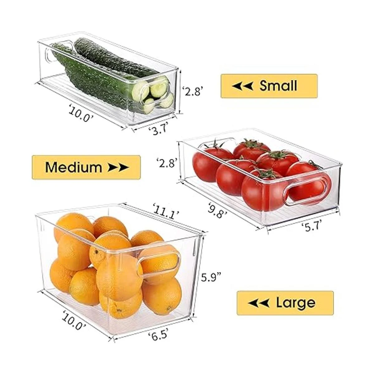 Alta calidad y seguro para los alimentos: hecho de plástico PET duradero de alta calidad, sin BPA, sin cloro. Fácil de limpiar Lavar con agua jabonosa suave o agua. No colocar en el lavavajillas. Los pequeños contenedores organizadores miden 10 x 4 x 3 pulgadas, los contenedores organizadores medianos miden 10 x 6 x 3 pulgadas, los contenedores organizadores grandes miden 11.2 x 7.8 x 6 pulgadas.