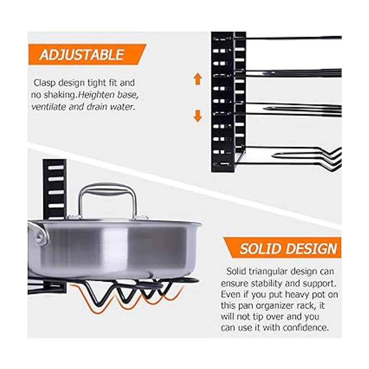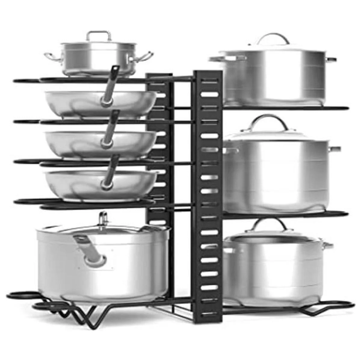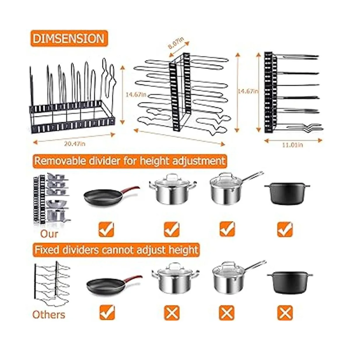 Altura y posición: nuestro organizador de ollas viene con 8 niveles ajustables, puedes ajustar fácilmente la altura y la posición de este estante para ollas. Te permite ajustarlo al tamaño adecuado para adaptarse a tus ollas y sartenes.