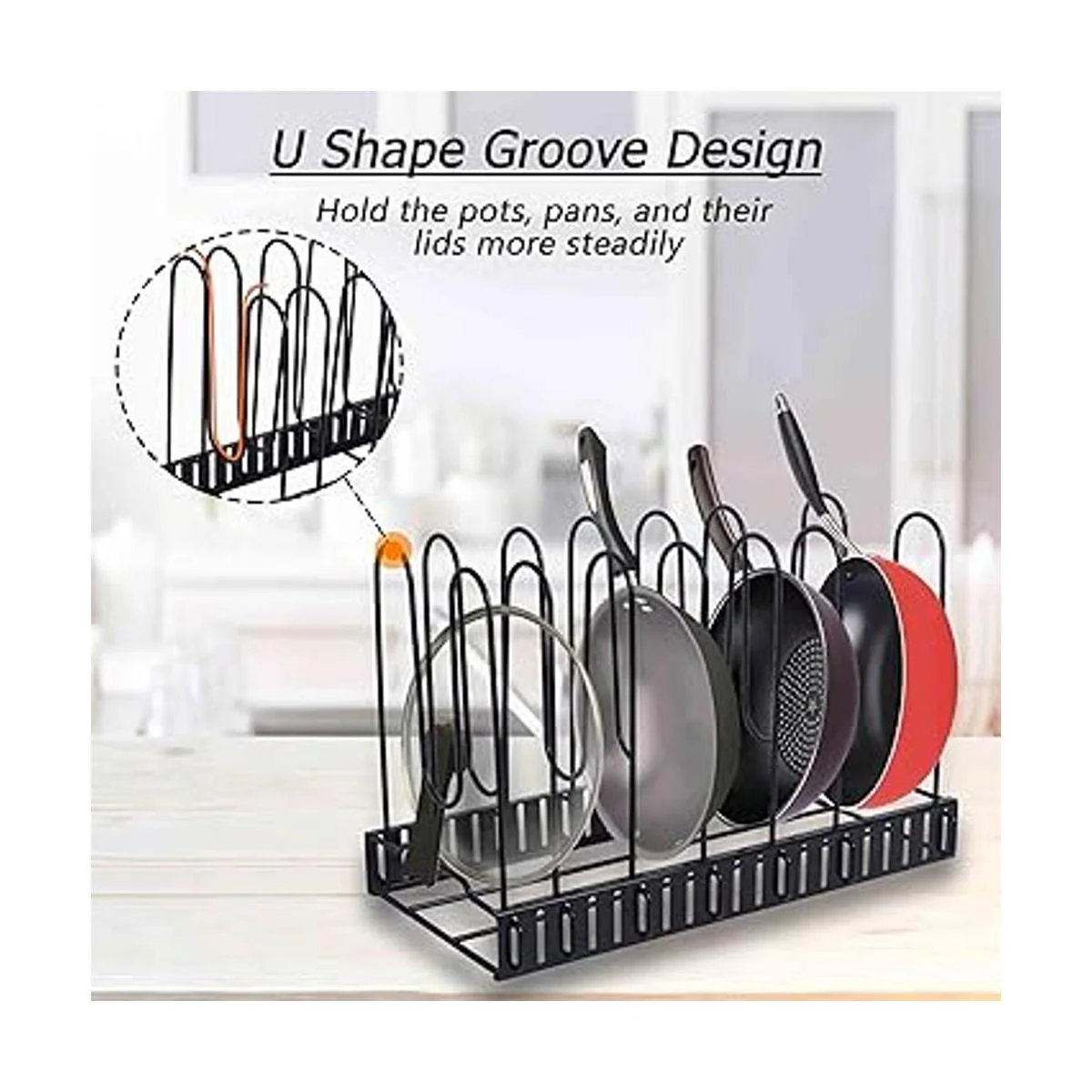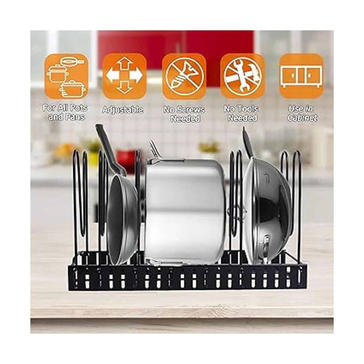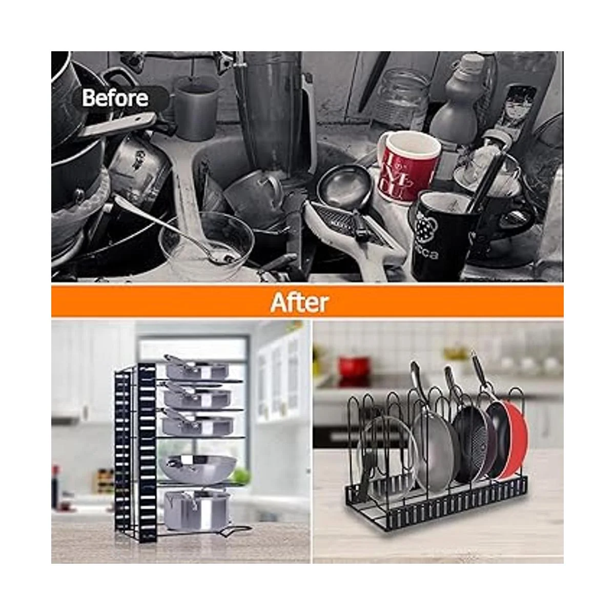 Altura y posición: nuestro organizador de ollas viene con 8 niveles ajustables, puedes ajustar fácilmente la altura y la posición de este estante para ollas. Te permite ajustarlo al tamaño adecuado para adaptarse a tus ollas y sartenes.