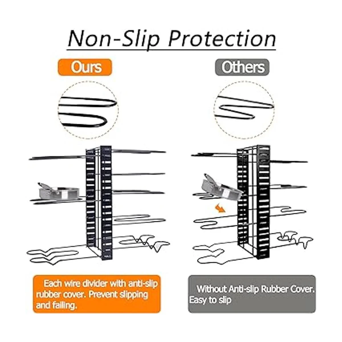 Protección antideslizante: nuestro estante para sartenes tiene un revestimiento de goma antideslizante en los divisores, lo que significa que evita que las herramientas de cocina se rayen y resbalen. Se resuelve el problema de que las ollas y sartenes se deslicen fácilmente y se rayen.