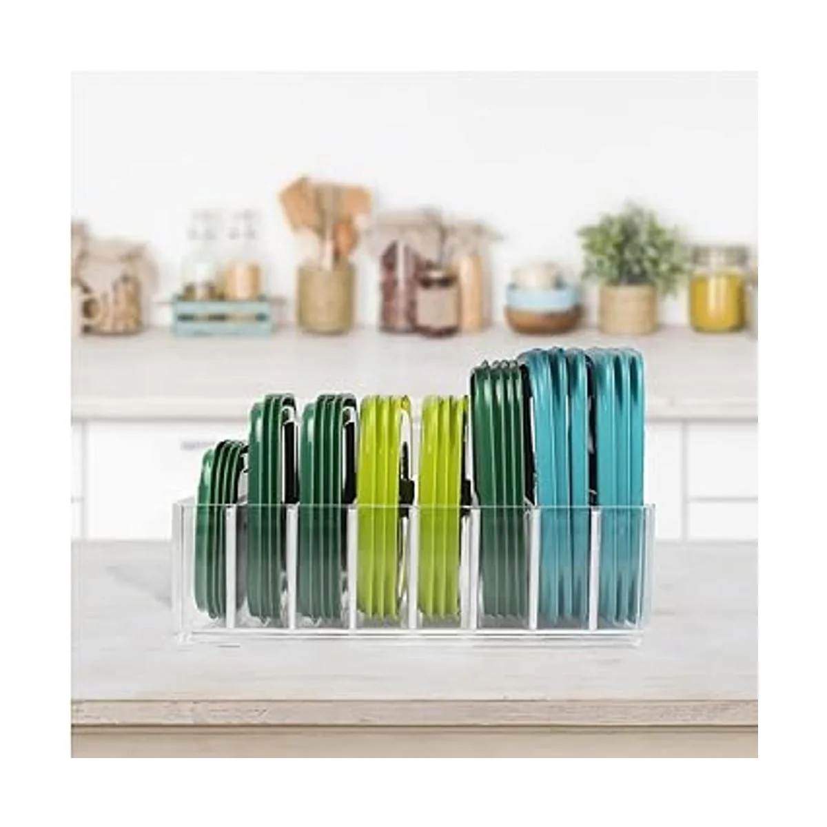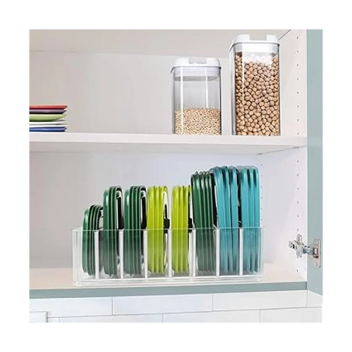 Organizador de tapa para contenedor de almacenamiento de alimentos, soporte de tapa de plástico Bawuie con 7 divisores ajustables para gabinete y cajón de despensa, organización de tapa de armario de encimera, grande, transparente