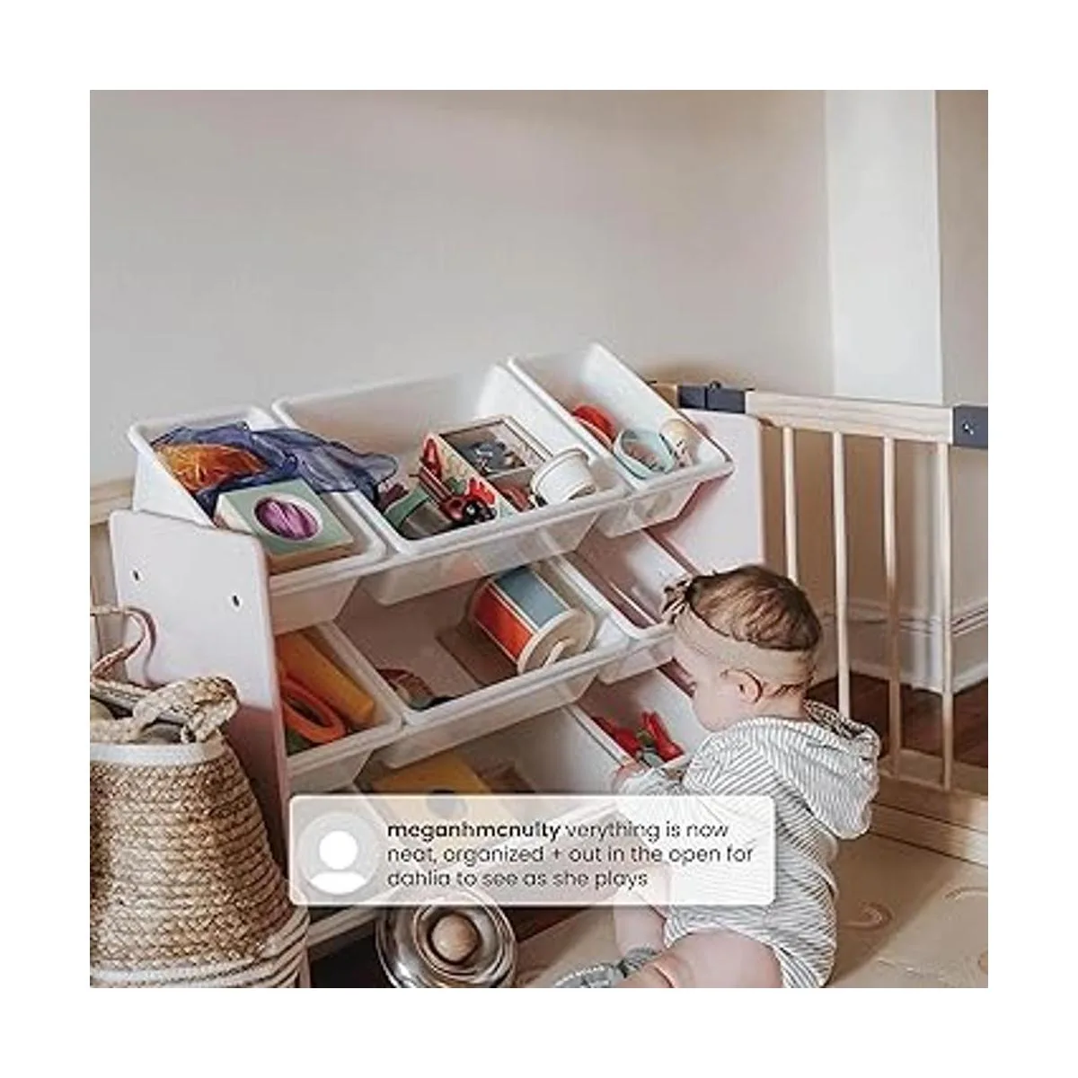 A PLACE FOR EVERYTHING: Nine 9 plastic bins in varying sizes easily stow books, toys, art supplies or books