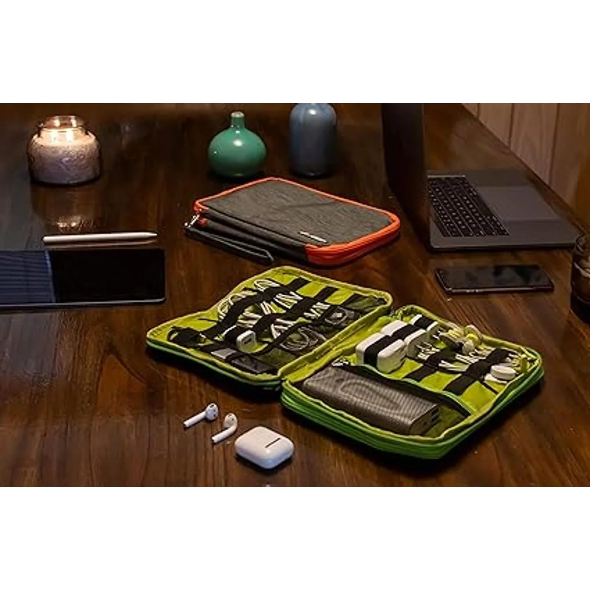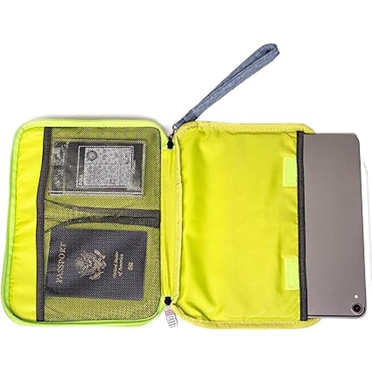 Organizador electrónico de tres capas y organizador de viaje para tabletas, cables y cargadores. Tamaño XL para tabletas de hasta 10 pulgadas. azul y verde brillante