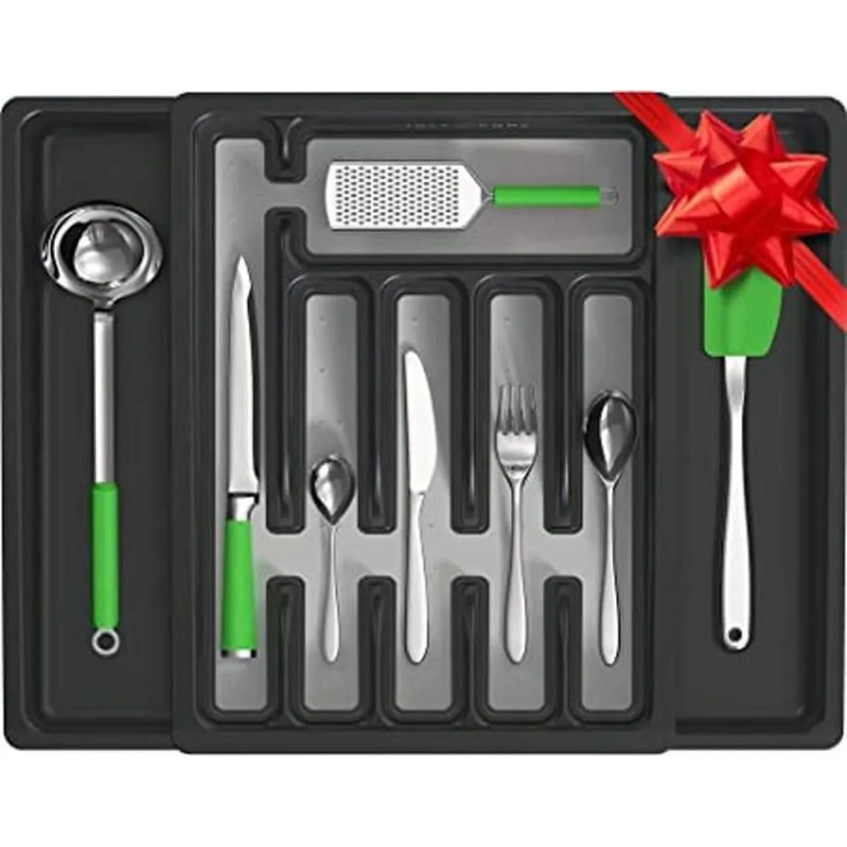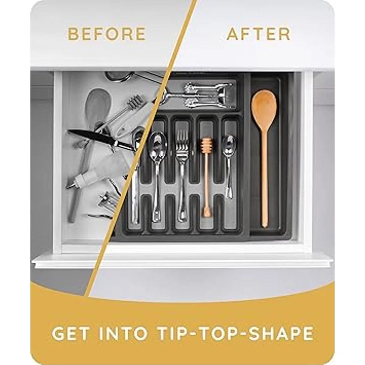 Encuentra lo que necesitas rápido: nos complace anunciar nuestro primer soporte de plástico para cubiertos. Fabricado con ingenio de alta clase para ofrecerte una innovadora bandeja de cubiertos que seguramente mantendrá tus cajones de cocina limpios y ordenados. Su composición ampliable hace de esta una bandeja de plástico óptima para uso en cajones debido a su función de ajuste. Este organizador de cubiertos proporciona espacio más que suficiente para utensilios diarios y uso de servir.