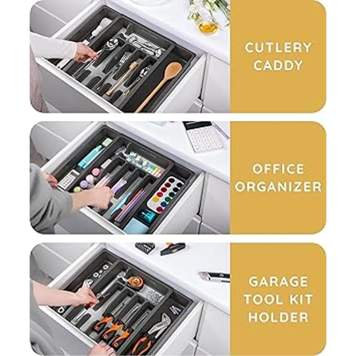 Mantén las cosas en orden: utiliza nuestra bandeja de plástico para organizar no solo tus cajones de cocina, sino en tu tocador para maquillaje, o para suministros de oficina, herramientas de trabajo en el garaje, e incluso varios artículos de manualidades y nuevos artículos esenciales para el hogar. Estos organizadores de cajones te ayudan a evitar que las cosas se mezclen y tu espacio limpio durante más tiempo gracias a su diseño abierto y adaptable.