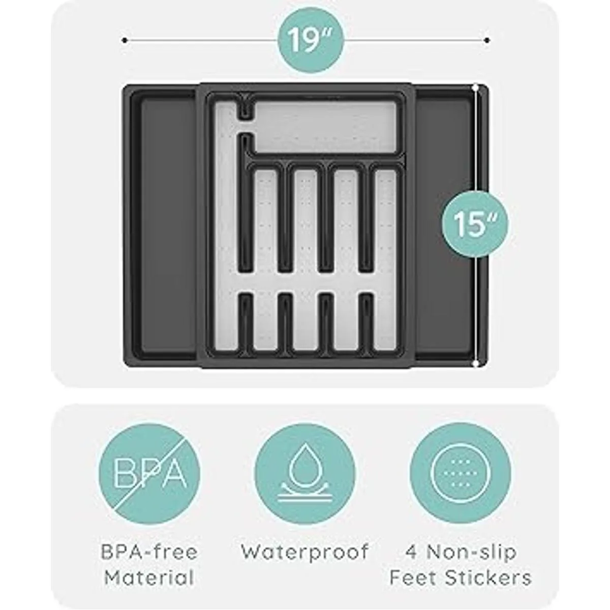 Hecho para uso diario: nuestra bandeja organizadora de cubiertos es única en su funcionalidad ampliable. Ajusta y amplía tu organizador de cubiertos de plástico para crear 2 compartimentos de almacenamiento adicionales. Ahora puedes personalizar y aprovechar al máximo el espacio de tu cajón con nuestro organizador de utensilios. Las alas laterales se expanden para pasar de 11.4 pulgadas a un amplio espacio de almacenamiento de 19 pulgadas