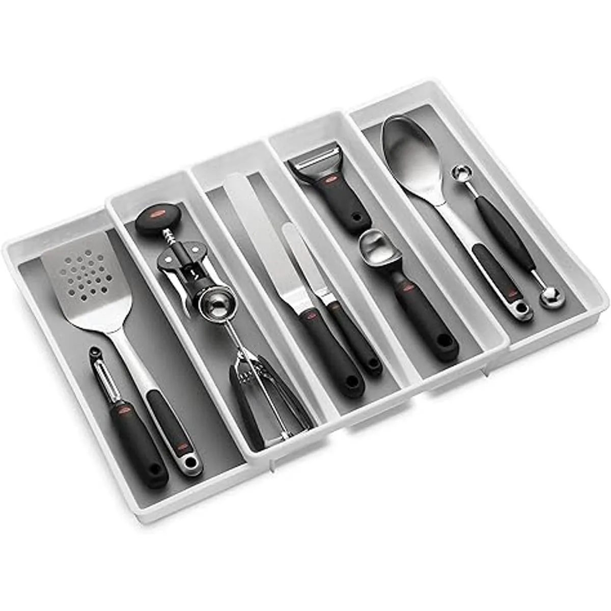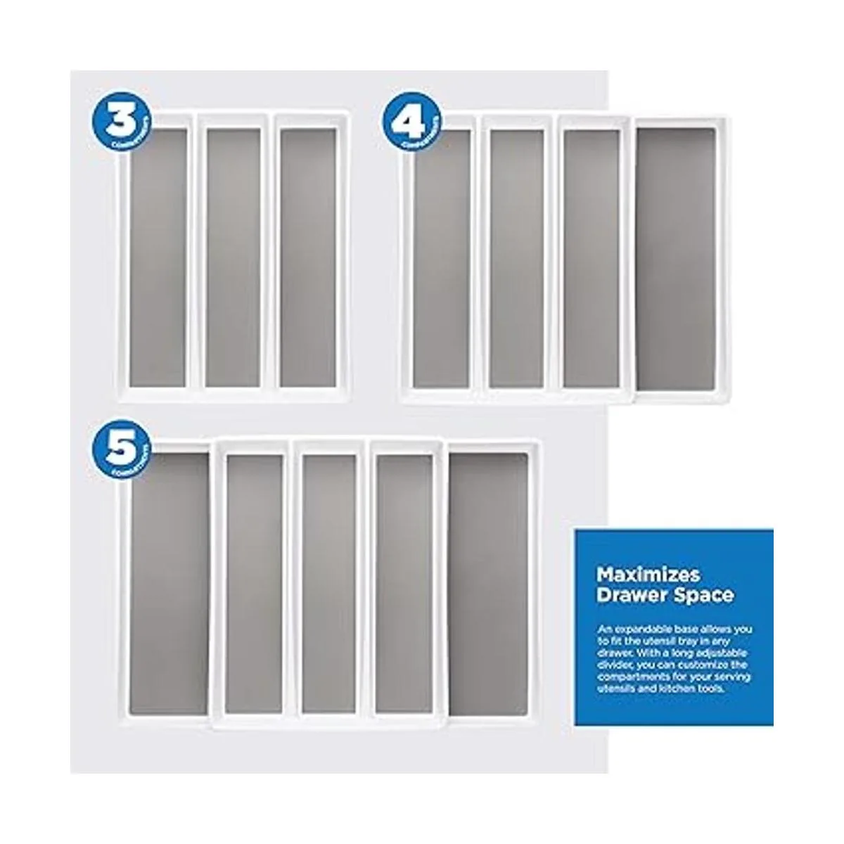 Ampliable y ajustable. Se expande de 13 a 23 pulgadas de ancho, cabe fácilmente en la mayoría de cajones de cocina, se ajusta al ancho de tu cajón para un ajuste personalizado instantáneo
